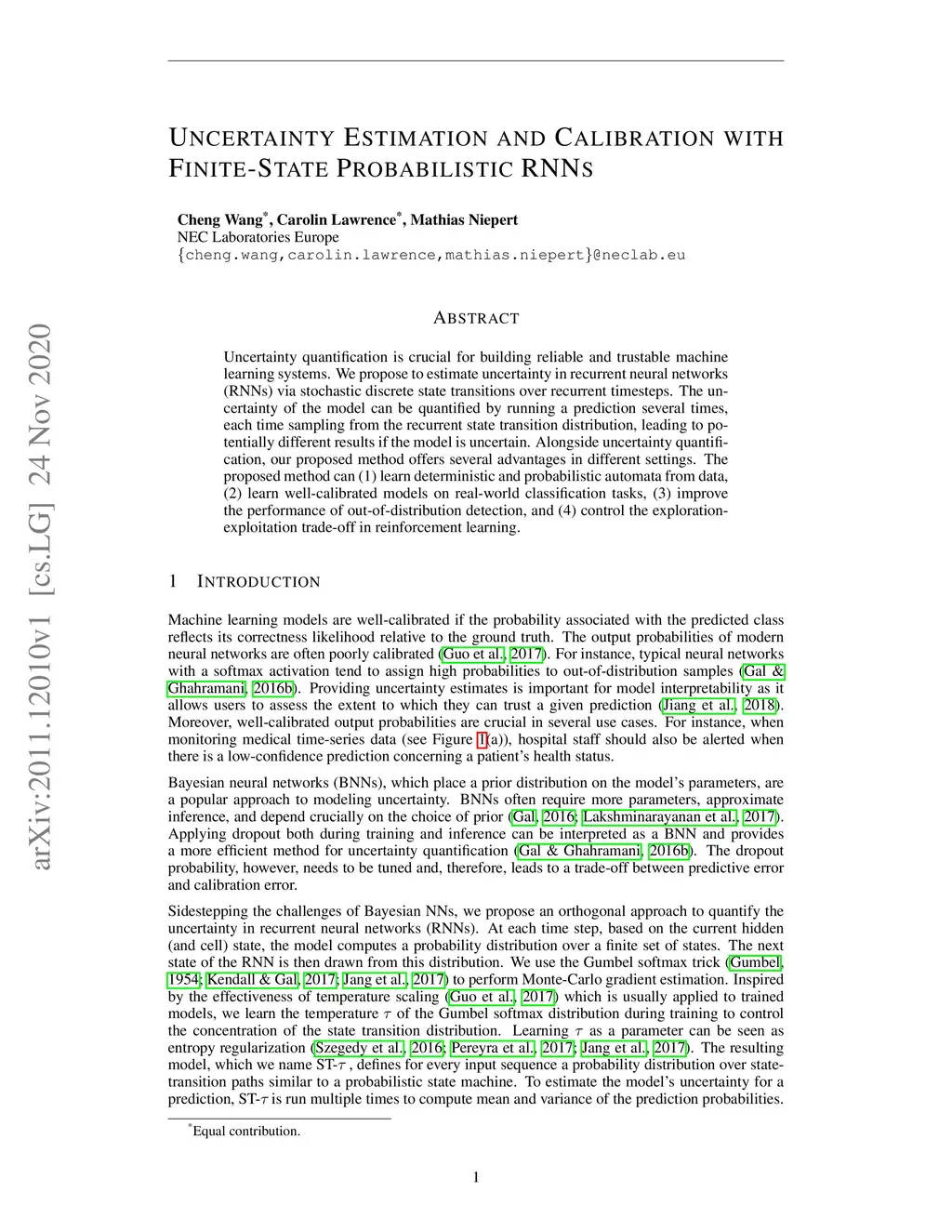 Uncertainty quantification is crucial for building reliable and trustable machine learning systems. We propose to estimate uncertainty in recurrent neural networks (RNNs) via stochastic discrete state transitions over recurrent timesteps. The uncertainty of the model can be quantified by running a prediction several times, each time sampling from the recurrent state transition distribution, leading to potentially different results if the model is uncertain. Alongside uncertainty quantification, our proposed method offers several advantages in different settings. The proposed method can (1) learn deterministic and probabilistic automata from data, (2) learn well-calibrated models on real-world classification tasks, (3) improve the performance of out-of-distribution detection, and (4) control the exploration-exploitation trade-off in reinforcement learning.