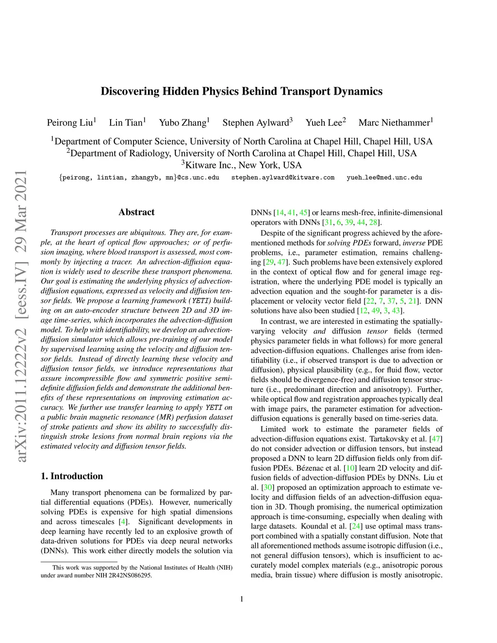 Transport processes are ubiquitous. They are, for example, at the heart of optical flow approaches; or of perfusion imaging, where blood transport is assessed, most commonly by injecting a tracer. An advection-diffusion equation is widely used to describe these transport phenomena. Our goal is estimating the underlying physics of advection-diffusion equations, expressed as velocity and diffusion tensor fields. We propose a learning framework (YETI) building on an auto-encoder structure between 2D and 3D image time-series, which incorporates the advection-diffusion model. To help with identifiability, we develop an advection-diffusion simulator which allows pre-training of our model by supervised learning using the velocity and diffusion tensor fields. Instead of directly learning these velocity and diffusion tensor fields, we introduce representations that assure incompressible flow and symmetric positive semi-definite diffusion fields and demonstrate the additional benefits of these representations on improving estimation accuracy. We further use transfer learning to apply YETI on a public brain magnetic resonance (MR) perfusion dataset of stroke patients and show its ability to successfully distinguish stroke lesions from normal brain regions via the estimated velocity and diffusion tensor fields.