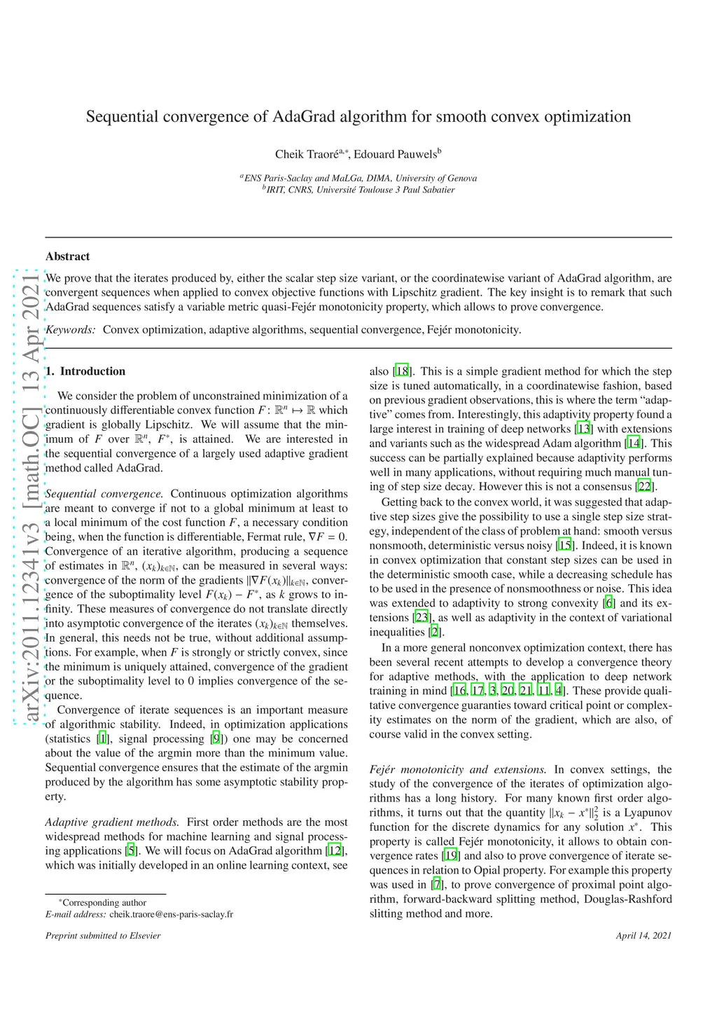 Sequential convergence of AdaGrad algorithm for smooth convex