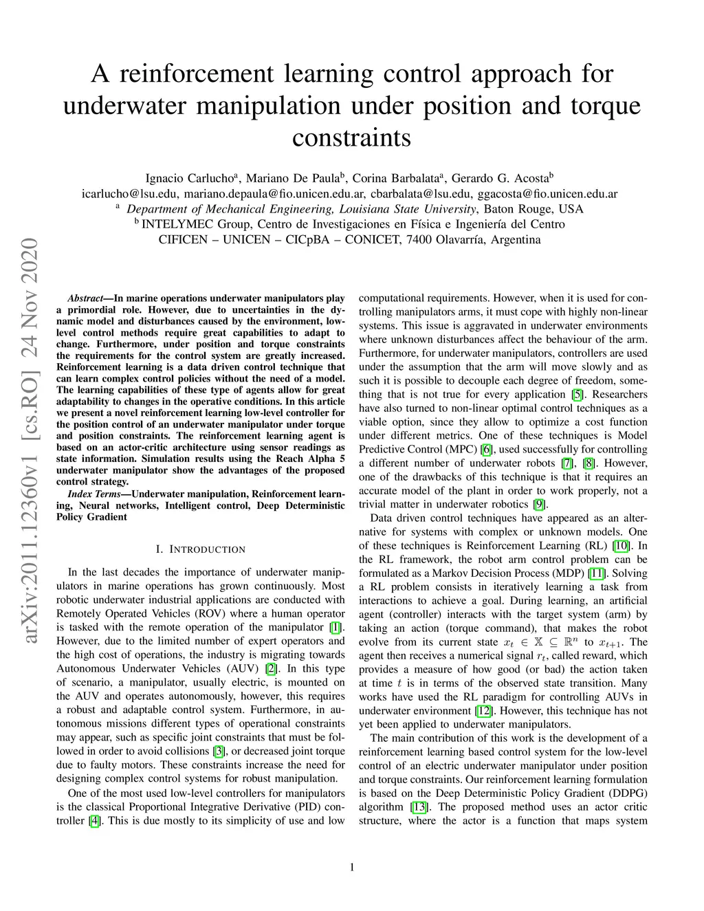 A reinforcement learning control approach for underwater manipulation