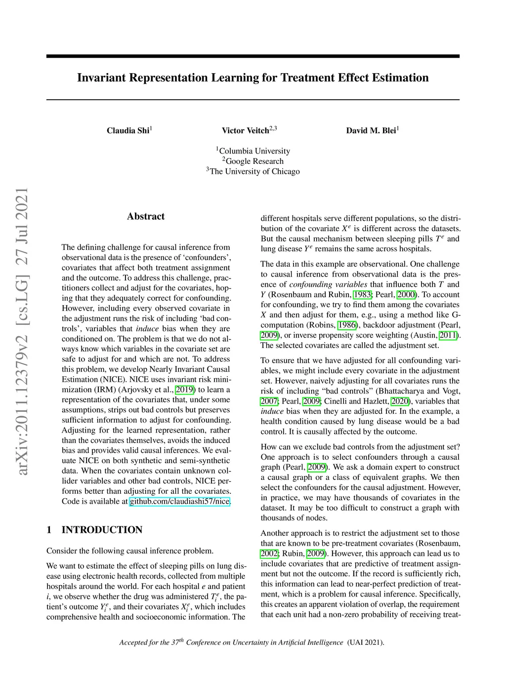 The defining challenge for causal inference from observational data is the presence of `confounders', covariates that affect both treatment assignment and the outcome. To address this challenge, practitioners collect and adjust for the covariates, hoping that they adequately correct for confounding. However, including every observed covariate in the adjustment runs the risk of including `bad controls', variables that induce bias when they are conditioned on. The problem is that we do not always know which variables in the covariate set are safe to adjust for and which are not. To address this problem, we develop Nearly Invariant Causal Estimation (NICE). NICE uses invariant risk minimization (IRM) [Arj19] to learn a representation of the covariates that, under some assumptions, strips out bad controls but preserves sufficient information to adjust for confounding. Adjusting for the learned representation, rather than the covariates themselves, avoids the induced bias and provides valid causal inferences. We evaluate NICE on both synthetic and semi-synthetic data. When the covariates contain unknown collider variables and other bad controls, NICE performs better than adjusting for all the covariates.