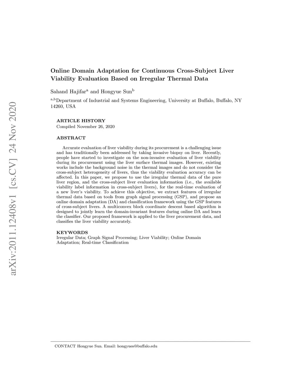 Accurate evaluation of liver viability during its procurement is a challenging issue and has traditionally been addressed by taking invasive biopsy on liver. Recently, people have started to investigate on the non-invasive evaluation of liver viability during its procurement using the liver surface thermal images. However, existing works include the background noise in the thermal images and do not consider the cross-subject heterogeneity of livers, thus the viability evaluation accuracy can be affected. In this paper, we propose to use the irregular thermal data of the pure liver region, and the cross-subject liver evaluation information (i.e., the available viability label information in cross-subject livers), for the real-time evaluation of a new liver's viability. To achieve this objective, we extract features of irregular thermal data based on tools from graph signal processing (GSP), and propose an online domain adaptation (DA) and classification framework using the GSP features of cross-subject livers. A multiconvex block coordinate descent based algorithm is designed to jointly learn the domain-invariant features during online DA and learn the classifier. Our proposed framework is applied to the liver procurement data, and classifies the liver viability accurately.