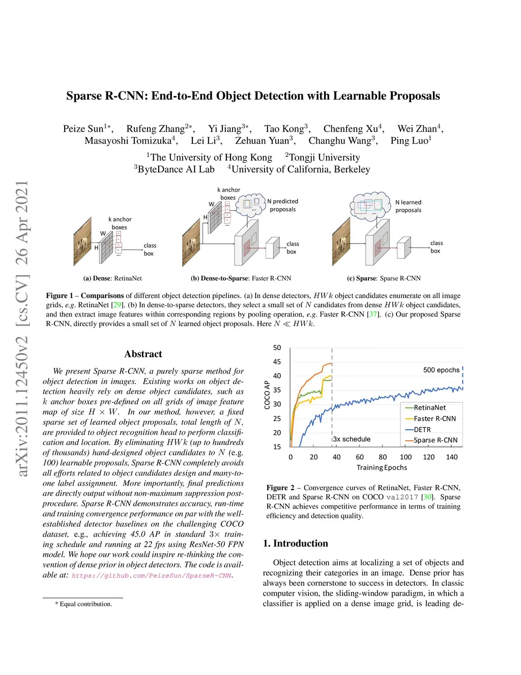 We present Sparse R-CNN, a purely sparse method for object detection in images. Existing works on object detection heavily rely on dense object candidates, such as anchor boxes pre-defined on all grids of image feature map of size . In our method, however, a fixed sparse set of learned object proposals, total length of , are provided to object recognition head to perform classification and location. By eliminating (up to hundreds of thousands) hand-designed object candidates to (e.g. 100) learnable proposals, Sparse R-CNN completely avoids all efforts related to object candidates design and many-to-one label assignment. More importantly, final predictions are directly output without non-maximum suppression post-procedure. Sparse R-CNN demonstrates accuracy, run-time and training convergence performance on par with the well-established detector baselines on the challenging COCO dataset, e.g., achieving 45.0 AP in standard training schedule and running at 22 fps using ResNet-50 FPN model. We hope our work could inspire re-thinking the convention of dense prior in object detectors. The code is available at: https://github.com/PeizeSun/SparseR-CNN.