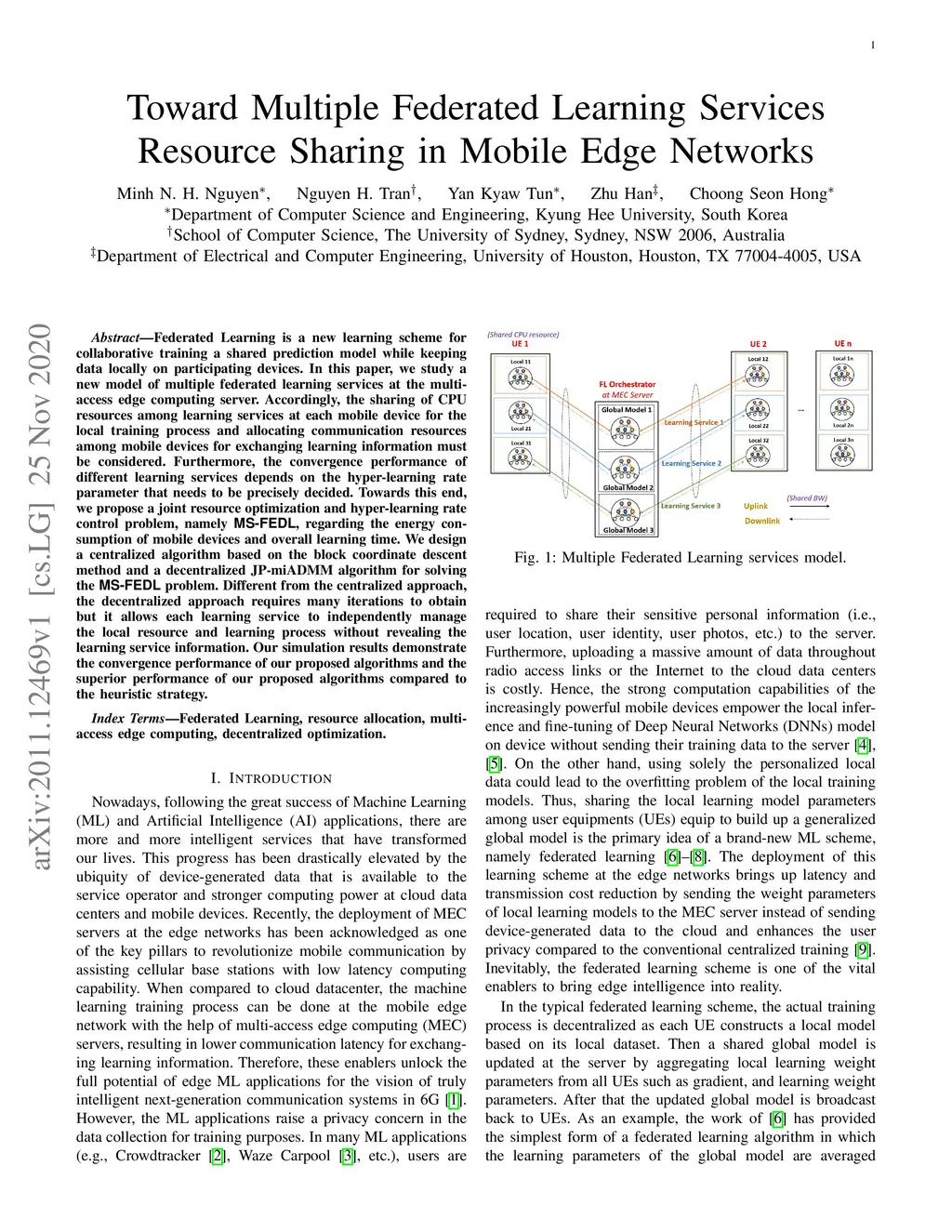 Federated Learning is a new learning scheme for collaborative training a shared prediction model while keeping data locally on participating devices. In this paper, we study a new model of multiple federated learning services at the multi-access edge computing server. Accordingly, the sharing of CPU resources among learning services at each mobile device for the local training process and allocating communication resources among mobile devices for exchanging learning information must be considered. Furthermore, the convergence performance of different learning services depends on the hyper-learning rate parameter that needs to be precisely decided. Towards this end, we propose a joint resource optimization and hyper-learning rate control problem, namely MS-FEDL, regarding the energy consumption of mobile devices and overall learning time. We design a centralized algorithm based on the block coordinate descent method and a decentralized JP-miADMM algorithm for solving the MS-FEDL problem. Different from the centralized approach, the decentralized approach requires many iterations to obtain but it allows each learning service to independently manage the local resource and learning process without revealing the learning service information. Our simulation results demonstrate the convergence performance of our proposed algorithms and the superior performance of our proposed algorithms compared to the heuristic strategy.