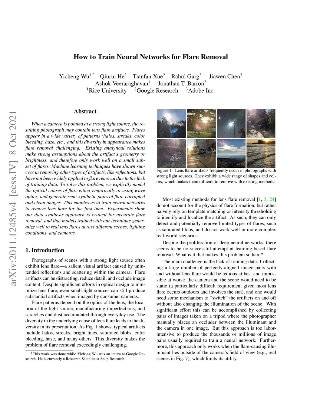 When a camera is pointed at a strong light source, the resulting photograph may contain lens flare artifacts. Flares appear in a wide variety of patterns (halos, streaks, color bleeding, haze, etc.) and this diversity in appearance makes flare removal challenging. Existing analytical solutions make strong assumptions about the artifact's geometry or brightness, and therefore only work well on a small subset of flares. Machine learning techniques have shown success in removing other types of artifacts, like reflections, but have not been widely applied to flare removal due to the lack of training data. To solve this problem, we explicitly model the optical causes of flare either empirically or using wave optics, and generate semi-synthetic pairs of flare-corrupted and clean images. This enables us to train neural networks to remove lens flare for the first time. Experiments show our data synthesis approach is critical for accurate flare removal, and that models trained with our technique generalize well to real lens flares across different scenes, lighting conditions, and cameras.