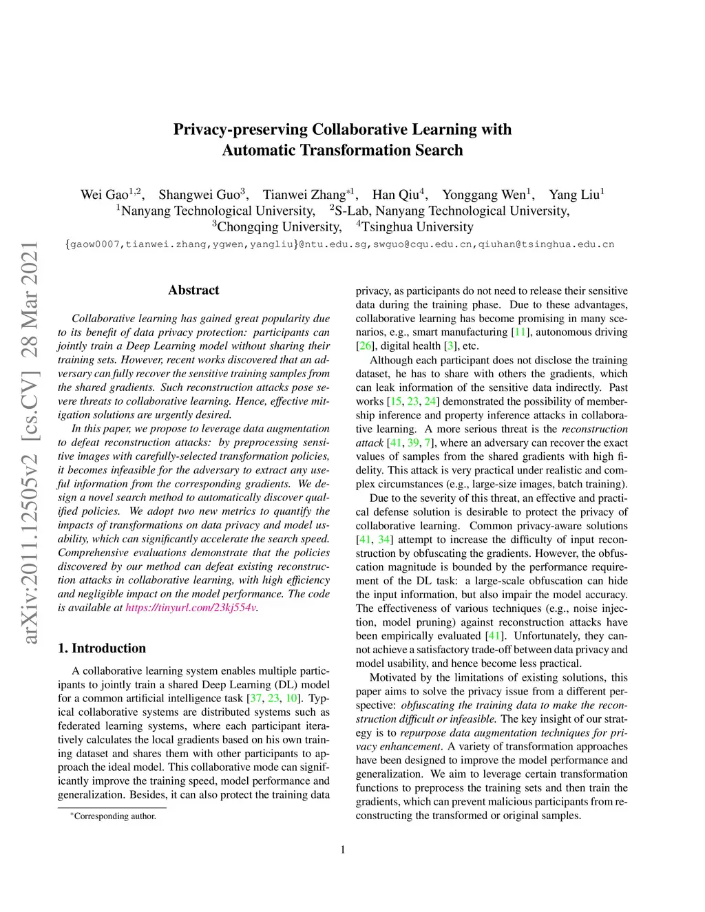 Privacy-preserving Collaborative Learning with Automatic Transformation