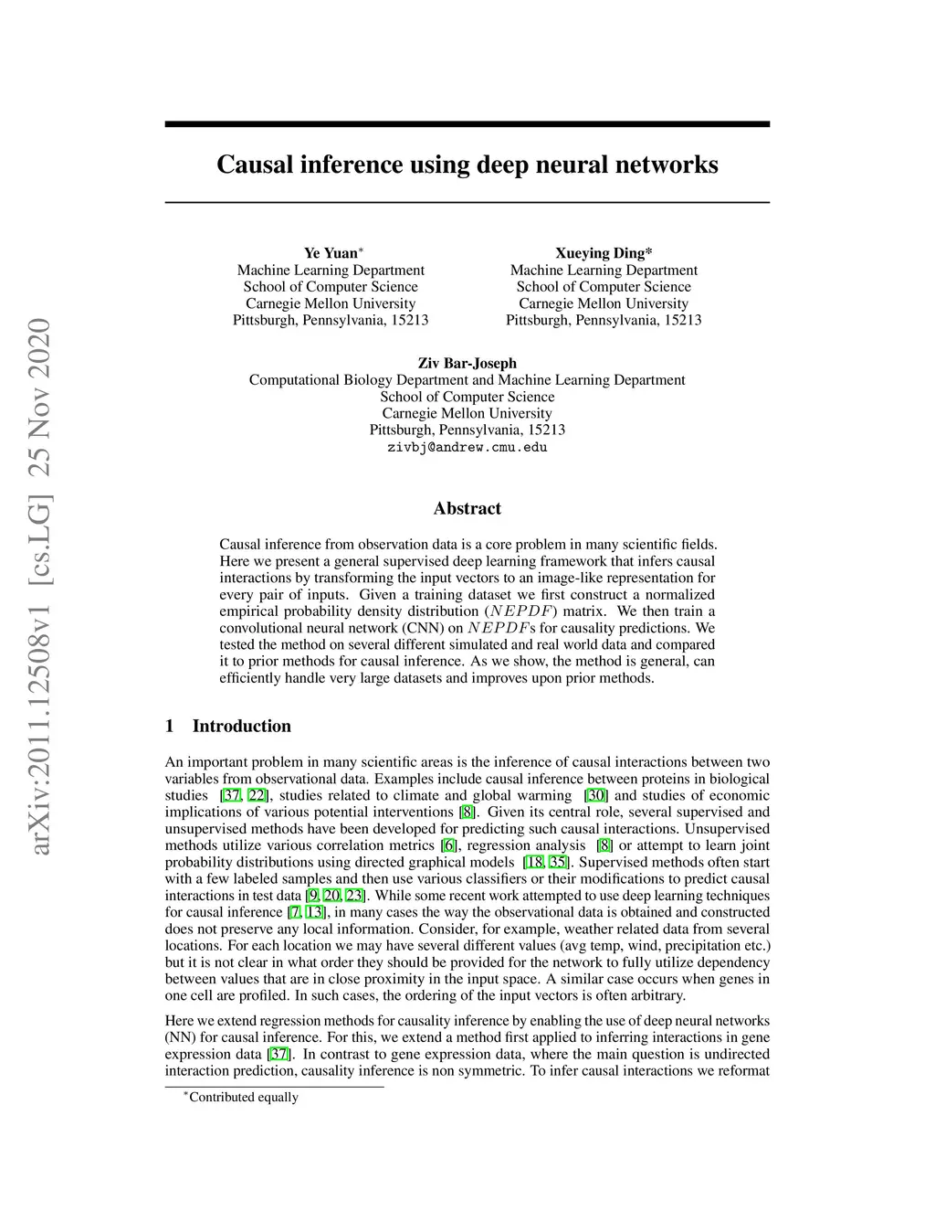 Causal inference from observation data is a core problem in many scientific fields. Here we present a general supervised deep learning framework that infers causal interactions by transforming the input vectors to an image-like representation for every pair of inputs. Given a training dataset we first construct a normalized empirical probability density distribution (NEPDF) matrix. We then train a convolutional neural network (CNN) on NEPDFs for causality predictions. We tested the method on several different simulated and real world data and compared it to prior methods for causal inference. As we show, the method is general, can efficiently handle very large datasets and improves upon prior methods.