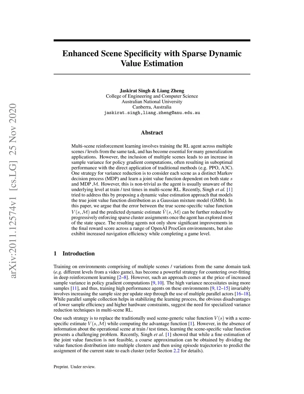Multi-scene reinforcement learning involves training the RL agent across multiple scenes / levels from the same task, and has become essential for many generalization applications. However, the inclusion of multiple scenes leads to an increase in sample variance for policy gradient computations, often resulting in suboptimal performance with the direct application of traditional methods (e.g. PPO, A3C). One strategy for variance reduction is to consider each scene as a distinct Markov decision process (MDP) and learn a joint value function dependent on both state (s) and MDP (M). However, this is non-trivial as the agent is usually unaware of the underlying level at train / test times in multi-scene RL. Recently, Singh et al. [1] tried to address this by proposing a dynamic value estimation approach that models the true joint value function distribution as a Gaussian mixture model (GMM). In this paper, we argue that the error between the true scene-specific value function and the predicted dynamic estimate can be further reduced by progressively enforcing sparse cluster assignments once the agent has explored most of the state space. The resulting agents not only show significant improvements in the final reward score across a range of OpenAI ProcGen environments, but also exhibit increased navigation efficiency while completing a game level.