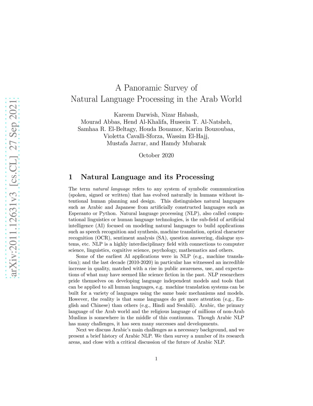 The term natural language refers to any system of symbolic communication (spoken, signed or written) without intentional human planning and design. This distinguishes natural languages such as Arabic and Japanese from artificially constructed languages such as Esperanto or Python. Natural language processing (NLP) is the sub-field of artificial intelligence (AI) focused on modeling natural languages to build applications such as speech recognition and synthesis, machine translation, optical character recognition (OCR), sentiment analysis (SA), question answering, dialogue systems, etc. NLP is a highly interdisciplinary field with connections to computer science, linguistics, cognitive science, psychology, mathematics and others. Some of the earliest AI applications were in NLP (e.g., machine translation); and the last decade (2010-2020) in particular has witnessed an incredible increase in quality, matched with a rise in public awareness, use, and expectations of what may have seemed like science fiction in the past. NLP researchers pride themselves on developing language independent models and tools that can be applied to all human languages, e.g. machine translation systems can be built for a variety of languages using the same basic mechanisms and models. However, the reality is that some languages do get more attention (e.g., English and Chinese) than others (e.g., Hindi and Swahili). Arabic, the primary language of the Arab world and the religious language of millions of non-Arab Muslims is somewhere in the middle of this continuum. Though Arabic NLP has many challenges, it has seen many successes and developments. Next we discuss Arabic's main challenges as a necessary background, and we present a brief history of Arabic NLP. We then survey a number of its research areas, and close with a critical discussion of the future of Arabic NLP.