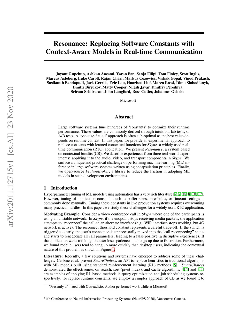 Large software systems tune hundreds of 'constants' to optimize their runtime performance. These values are commonly derived through intuition, lab tests, or A/B tests. A óne-size-fits-all' approach is often sub-optimal as the best value depends on runtime context. In this paper, we provide an experimental approach to replace constants with learned contextual functions for Skype - a widely used real-time communication (RTC) application. We present Resonance, a system based on contextual bandits (CB). We describe experiences from three real-world experiments: applying it to the audio, video, and transport components in Skype. We surface a unique and practical challenge of performing machine learning (ML) inference in large software systems written using encapsulation principles. Finally, we open-source FeatureBroker, a library to reduce the friction in adopting ML models in such development environments