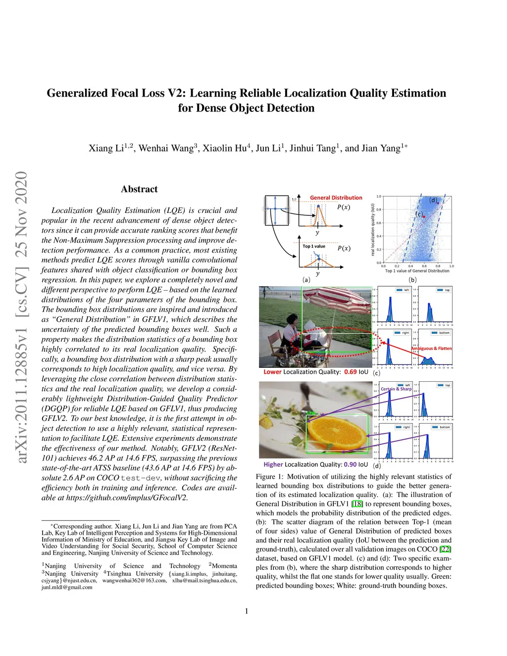 Localization Quality Estimation (LQE) is crucial and popular in the recent advancement of dense object detectors since it can provide accurate ranking scores that benefit the Non-Maximum Suppression processing and improve detection performance. As a common practice, most existing methods predict LQE scores through vanilla convolutional features shared with object classification or bounding box regression. In this paper, we explore a completely novel and different perspective to perform LQE -- based on the learned distributions of the four parameters of the bounding box. The bounding box distributions are inspired and introduced as "General Distribution" in GFLV1, which describes the uncertainty of the predicted bounding boxes well. Such a property makes the distribution statistics of a bounding box highly correlated to its real localization quality. Specifically, a bounding box distribution with a sharp peak usually corresponds to high localization quality, and vice versa. By leveraging the close correlation between distribution statistics and the real localization quality, we develop a considerably lightweight Distribution-Guided Quality Predictor (DGQP) for reliable LQE based on GFLV1, thus producing GFLV2. To our best knowledge, it is the first attempt in object detection to use a highly relevant, statistical representation to facilitate LQE. Extensive experiments demonstrate the effectiveness of our method. Notably, GFLV2 (ResNet-101) achieves 46.2 AP at 14.6 FPS, surpassing the previous state-of-the-art ATSS baseline (43.6 AP at 14.6 FPS) by absolute 2.6 AP on COCO {\tt test-dev}, without sacrificing the efficiency both in training and inference. Code will be available at https://github.com/implus/GFocalV2.