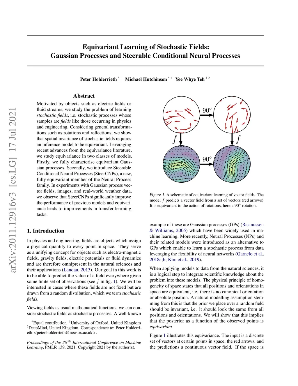 Motivated by objects such as electric fields or fluid streams, we study the problem of learning stochastic fields, i.e. stochastic processes whose samples are fields like those occurring in physics and engineering. Considering general transformations such as rotations and reflections, we show that spatial invariance of stochastic fields requires an inference model to be equivariant. Leveraging recent advances from the equivariance literature, we study equivariance in two classes of models. Firstly, we fully characterise equivariant Gaussian processes. Secondly, we introduce Steerable Conditional Neural Processes (SteerCNPs), a new, fully equivariant member of the Neural Process family. In experiments with Gaussian process vector fields, images, and real-world weather data, we observe that SteerCNPs significantly improve the performance of previous models and equivariance leads to improvements in transfer learning tasks.