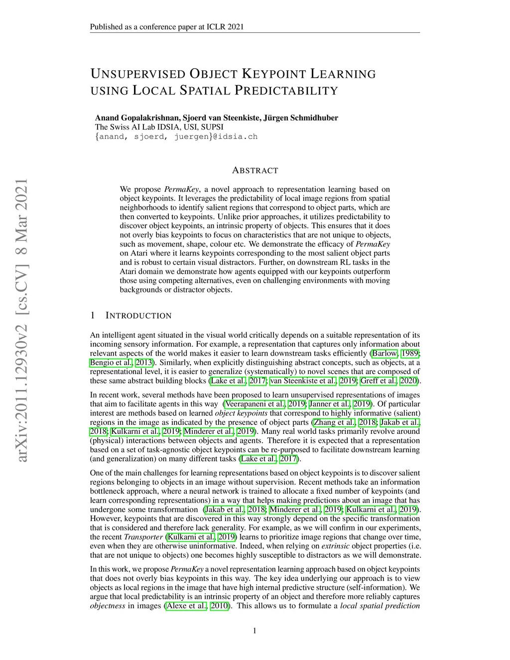 We propose PermaKey, a novel approach to representation learning based on object keypoints. It leverages the predictability of local image regions from spatial neighborhoods to identify salient regions that correspond to object parts, which are then converted to keypoints. Unlike prior approaches, it utilizes predictability to discover object keypoints, an intrinsic property of objects. This ensures that it does not overly bias keypoints to focus on characteristics that are not unique to objects, such as movement, shape, colour etc. We demonstrate the efficacy of PermaKey on Atari where it learns keypoints corresponding to the most salient object parts and is robust to certain visual distractors. Further, on downstream RL tasks in the Atari domain we demonstrate how agents equipped with our keypoints outperform those using competing alternatives, even on challenging environments with moving backgrounds or distractor objects.