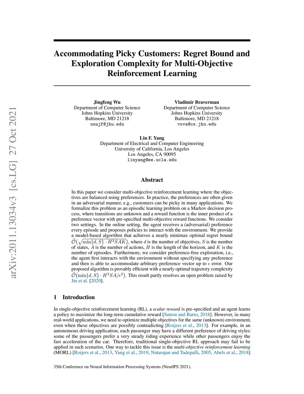 In this paper we consider multi-objective reinforcement learning where the objectives are balanced using preferences. In practice, the preferences are often given in an adversarial manner, e.g., customers can be picky in many applications. We formalize this problem as an episodic learning problem on a Markov decision process, where transitions are unknown and a reward function is the inner product of a preference vector with pre-specified multi-objective reward functions. We consider two settings. In the online setting, the agent receives a (adversarial) preference every episode and proposes policies to interact with the environment. We provide a model-based algorithm that achieves a nearly minimax optimal regret bound , where is the number of objectives, is the number of states, is the number of actions, is the length of the horizon, and is the number of episodes. Furthermore, we consider preference-free exploration, i.e., the agent first interacts with the environment without specifying any preference and then is able to accommodate arbitrary preference vector up to error. Our proposed algorithm is provably efficient with a nearly optimal trajectory complexity . This result partly resolves an open problem raised by \citet{jin2020reward}.