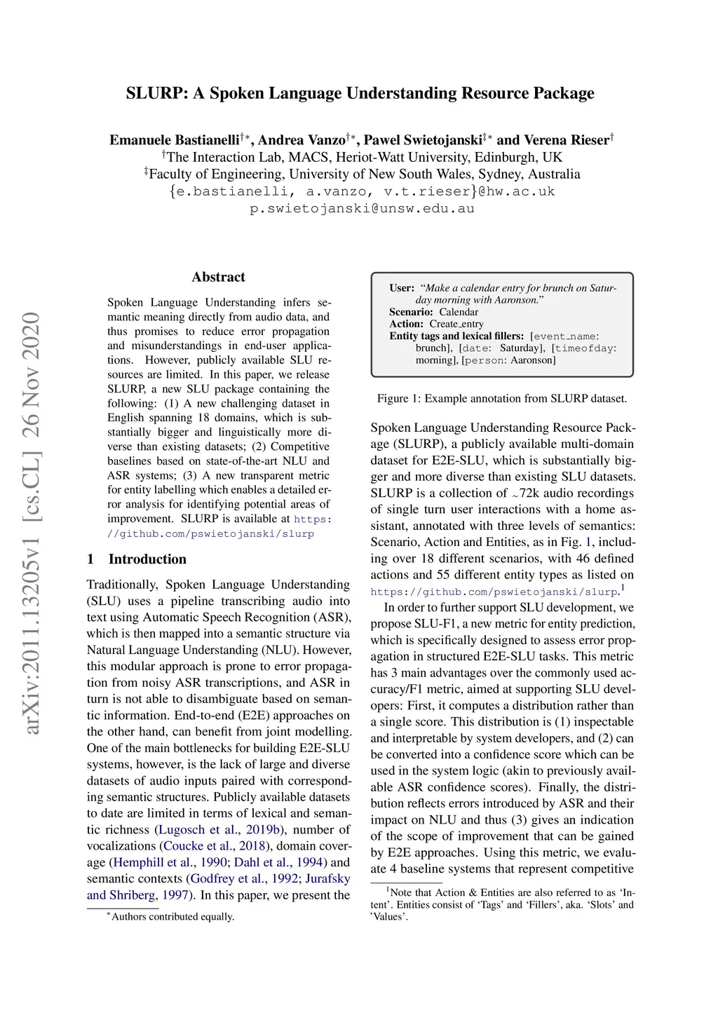 Spoken Language Understanding infers semantic meaning directly from audio data, and thus promises to reduce error propagation and misunderstandings in end-user applications. However, publicly available SLU resources are limited. In this paper, we release SLURP, a new SLU package containing the following: (1) A new challenging dataset in English spanning 18 domains, which is substantially bigger and linguistically more diverse than existing datasets; (2) Competitive baselines based on state-of-the-art NLU and ASR systems; (3) A new transparent metric for entity labelling which enables a detailed error analysis for identifying potential areas of improvement. SLURP is available at https: //github.com/pswietojanski/slurp.