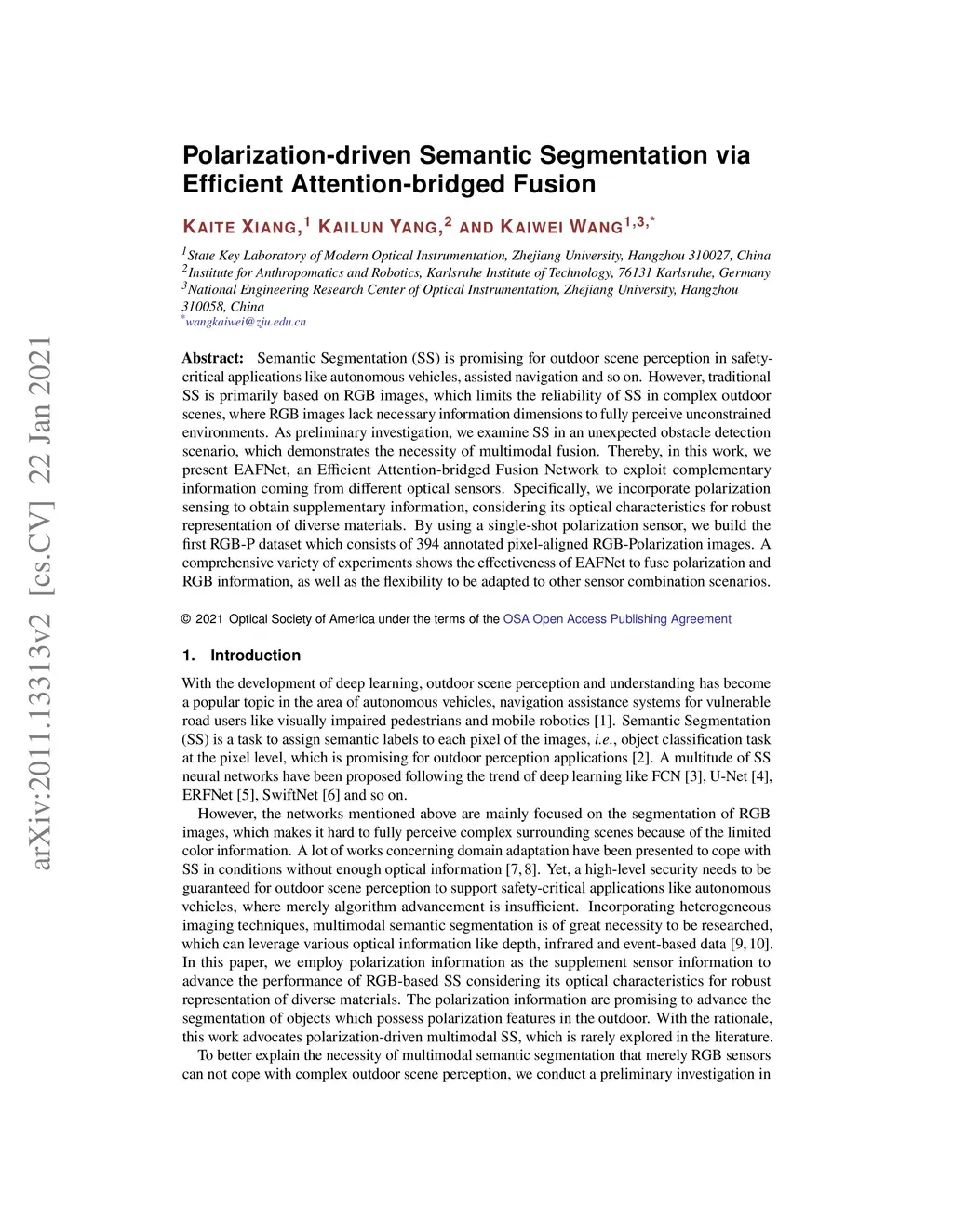 Semantic Segmentation (SS) is promising for outdoor scene perception in safety-critical applications like autonomous vehicles, assisted navigation and so on. However, traditional SS is primarily based on RGB images, which limits the reliability of SS in complex outdoor scenes, where RGB images lack necessary information dimensions to fully perceive unconstrained environments. As preliminary investigation, we examine SS in an unexpected obstacle detection scenario, which demonstrates the necessity of multimodal fusion. Thereby, in this work, we present EAFNet, an Efficient Attention-bridged Fusion Network to exploit complementary information coming from different optical sensors. Specifically, we incorporate polarization sensing to obtain supplementary information, considering its optical characteristics for robust representation of diverse materials. By using a single-shot polarization sensor, we build the first RGB-P dataset which consists of 394 annotated pixel-aligned RGB-Polarization images. A comprehensive variety of experiments shows the effectiveness of EAFNet to fuse polarization and RGB information, as well as the flexibility to be adapted to other sensor combination scenarios.
