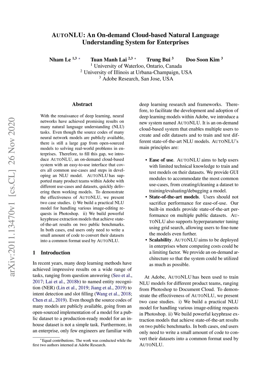 With the renaissance of deep learning, neural networks have achieved promising results on many natural language understanding (NLU) tasks. Even though the source codes of many neural network models are publicly available, there is still a large gap from open-sourced models to solving real-world problems in enterprises. Therefore, to fill this gap, we introduce AutoNLU, an on-demand cloud-based system with an easy-to-use interface that covers all common use-cases and steps in developing an NLU model. AutoNLU has supported many product teams within Adobe with different use-cases and datasets, quickly delivering them working models. To demonstrate the effectiveness of AutoNLU, we present two case studies. i) We build a practical NLU model for handling various image-editing requests in Photoshop. ii) We build powerful keyphrase extraction models that achieve state-of-the-art results on two public benchmarks. In both cases, end users only need to write a small amount of code to convert their datasets into a common format used by AutoNLU.
