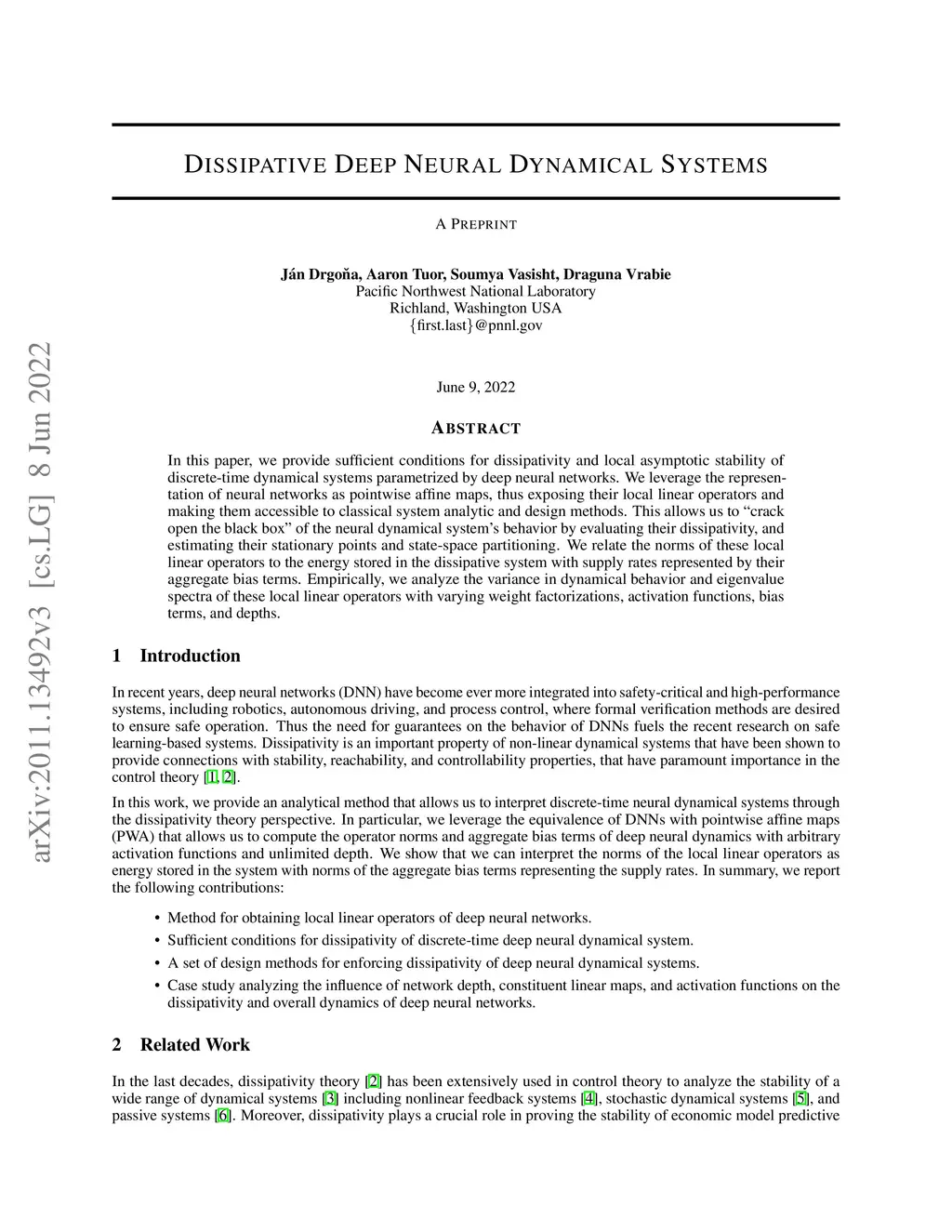 In this paper, we provide sufficient conditions for dissipativity and local asymptotic stability of discrete-time dynamical systems parametrized by deep neural networks. We leverage the representation of neural networks as pointwise affine maps, thus exposing their local linear operators and making them accessible to classical system analytic and design methods. This allows us to "crack open the black box" of the neural dynamical system's behavior by evaluating their dissipativity, and estimating their stationary points and state-space partitioning. We relate the norms of these local linear operators to the energy stored in the dissipative system with supply rates represented by their aggregate bias terms. Empirically, we analyze the variance in dynamical behavior and eigenvalue spectra of these local linear operators with varying weight factorizations, activation functions, bias terms, and depths.
