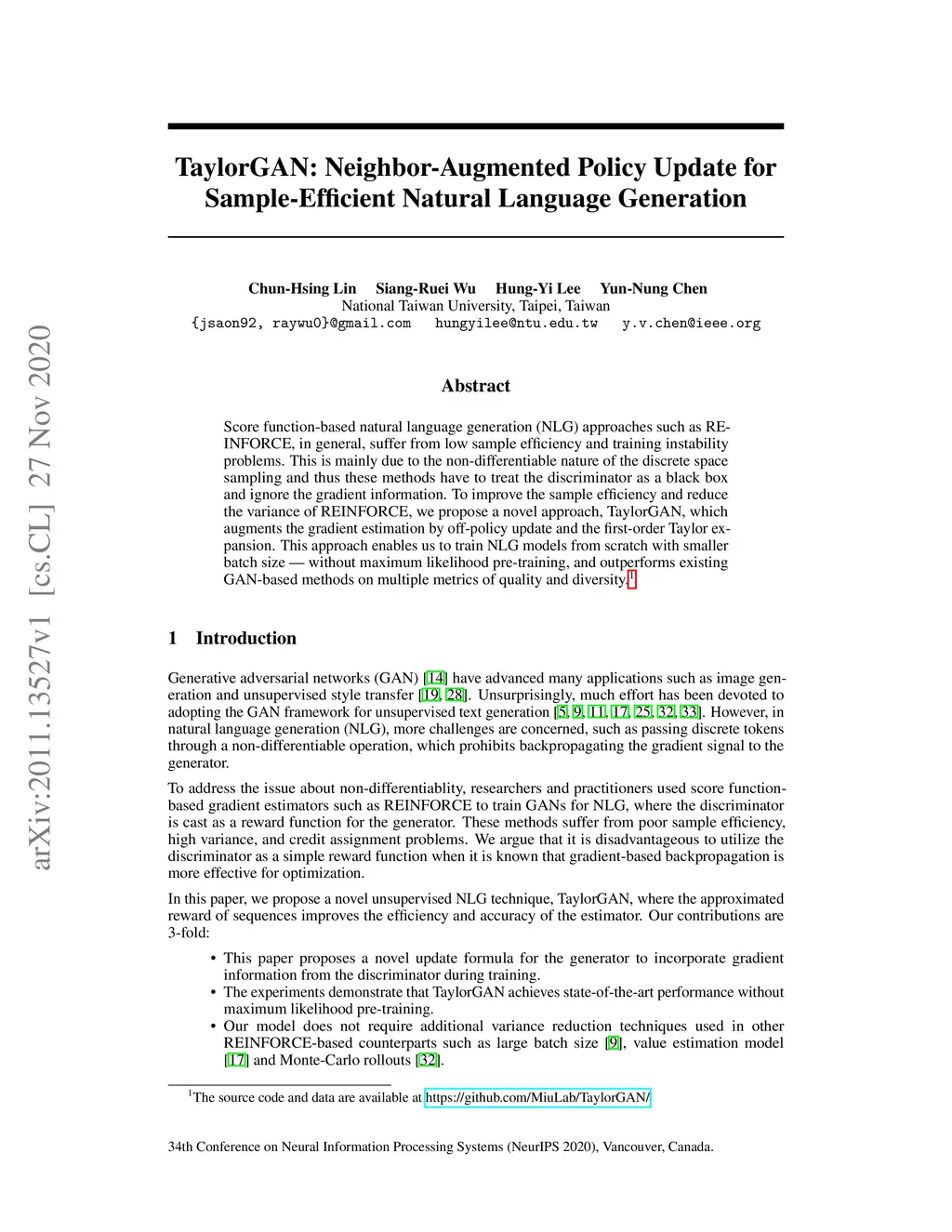 Score function-based natural language generation (NLG) approaches such as REINFORCE, in general, suffer from low sample efficiency and training instability problems. This is mainly due to the non-differentiable nature of the discrete space sampling and thus these methods have to treat the discriminator as a black box and ignore the gradient information. To improve the sample efficiency and reduce the variance of REINFORCE, we propose a novel approach, TaylorGAN, which augments the gradient estimation by off-policy update and the first-order Taylor expansion. This approach enables us to train NLG models from scratch with smaller batch size -- without maximum likelihood pre-training, and outperforms existing GAN-based methods on multiple metrics of quality and diversity. The source code and data are available at https://github.com/MiuLab/TaylorGAN