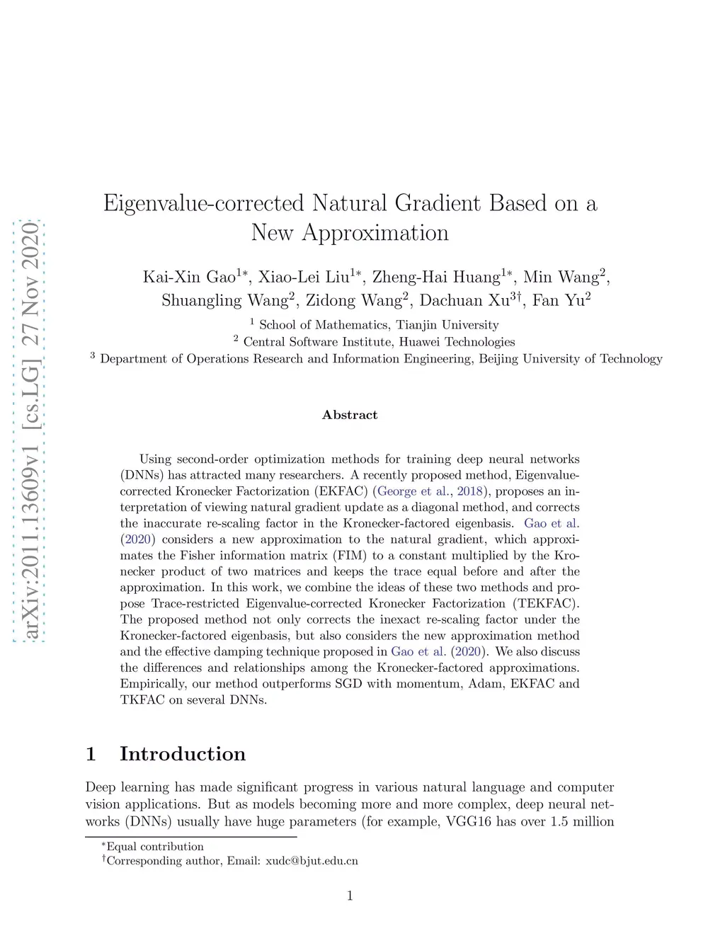 Using second-order optimization methods for training deep neural networks (DNNs) has attracted many researchers. A recently proposed method, Eigenvalue-corrected Kronecker Factorization (EKFAC) (George et al., 2018), proposes an interpretation of viewing natural gradient update as a diagonal method, and corrects the inaccurate re-scaling factor in the Kronecker-factored eigenbasis. Gao et al. (2020) considers a new approximation to the natural gradient, which approximates the Fisher information matrix (FIM) to a constant multiplied by the Kronecker product of two matrices and keeps the trace equal before and after the approximation. In this work, we combine the ideas of these two methods and propose Trace-restricted Eigenvalue-corrected Kronecker Factorization (TEKFAC). The proposed method not only corrects the inexact re-scaling factor under the Kronecker-factored eigenbasis, but also considers the new approximation method and the effective damping technique proposed in Gao et al. (2020). We also discuss the differences and relationships among the Kronecker-factored approximations. Empirically, our method outperforms SGD with momentum, Adam, EKFAC and TKFAC on several DNNs.