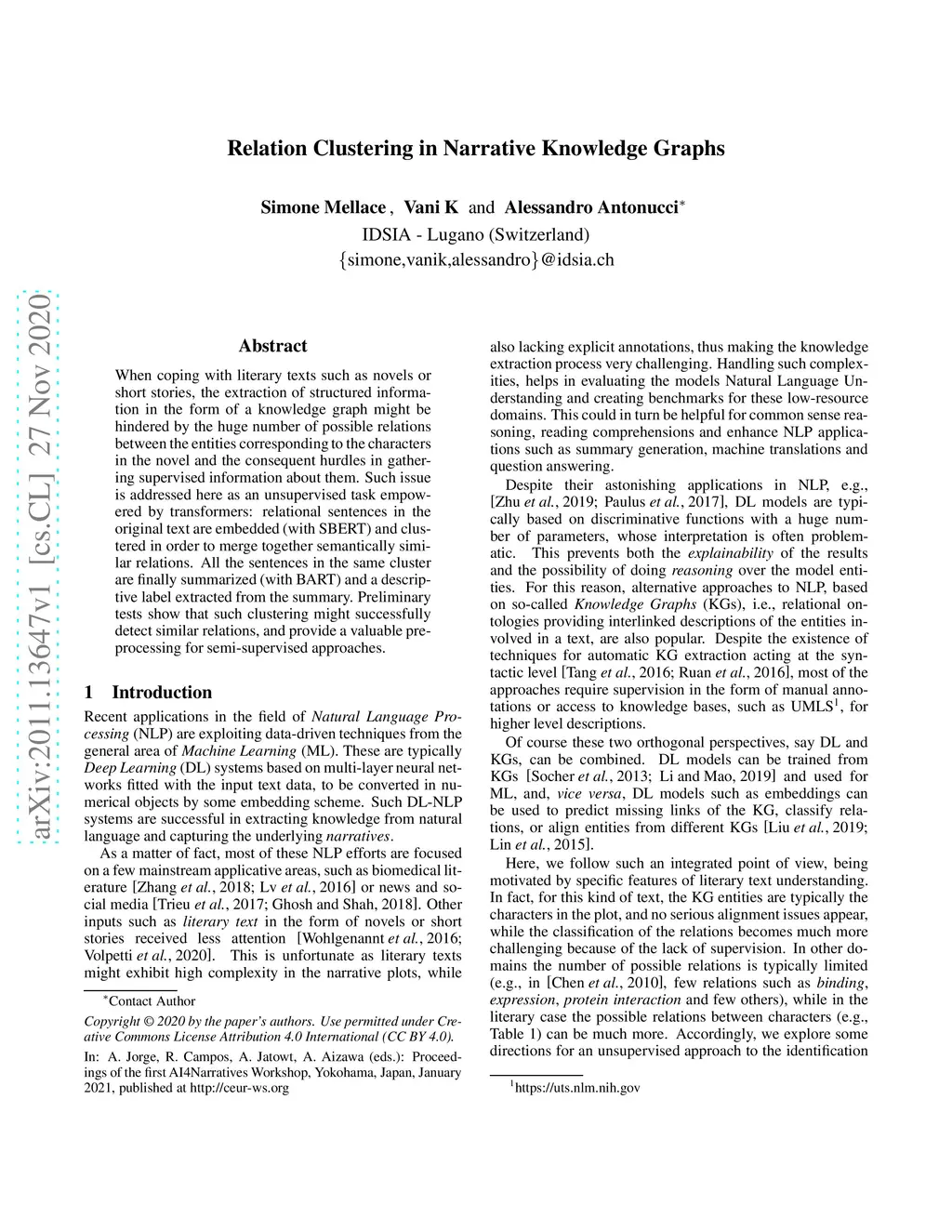 When coping with literary texts such as novels or short stories, the extraction of structured information in the form of a knowledge graph might be hindered by the huge number of possible relations between the entities corresponding to the characters in the novel and the consequent hurdles in gathering supervised information about them. Such issue is addressed here as an unsupervised task empowered by transformers: relational sentences in the original text are embedded (with SBERT) and clustered in order to merge together semantically similar relations. All the sentences in the same cluster are finally summarized (with BART) and a descriptive label extracted from the summary. Preliminary tests show that such clustering might successfully detect similar relations, and provide a valuable preprocessing for semi-supervised approaches.