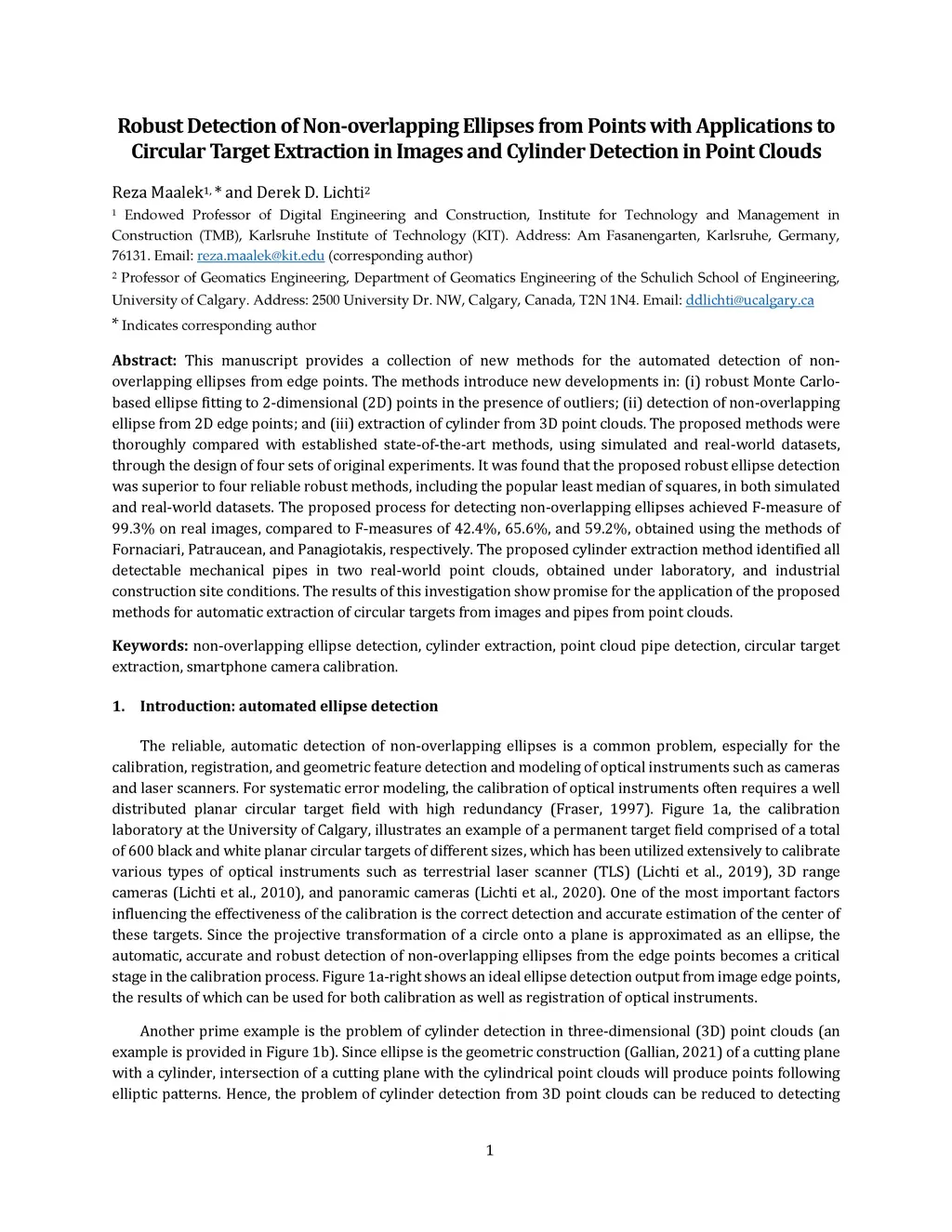 This manuscript provides a collection of new methods for the automated detection of non-overlapping ellipses from edge points. The methods introduce new developments in: (i) robust Monte Carlo-based ellipse fitting to 2-dimensional (2D) points in the presence of outliers; (ii) detection of non-overlapping ellipse from 2D edge points; and (iii) extraction of cylinder from 3D point clouds. The proposed methods were thoroughly compared with established state-of-the-art methods, using simulated and real-world datasets, through the design of four sets of original experiments. It was found that the proposed robust ellipse detection was superior to four reliable robust methods, including the popular least median of squares, in both simulated and real-world datasets. The proposed process for detecting non-overlapping ellipses achieved F-measure of 99.3% on real images, compared to F-measures of 42.4%, 65.6%, and 59.2%, obtained using the methods of Fornaciari, Patraucean, and Panagiotakis, respectively. The proposed cylinder extraction method identified all detectable mechanical pipes in two real-world point clouds, obtained under laboratory, and industrial construction site conditions. The results of this investigation show promise for the application of the proposed methods for automatic extraction of circular targets from images and pipes from point clouds.