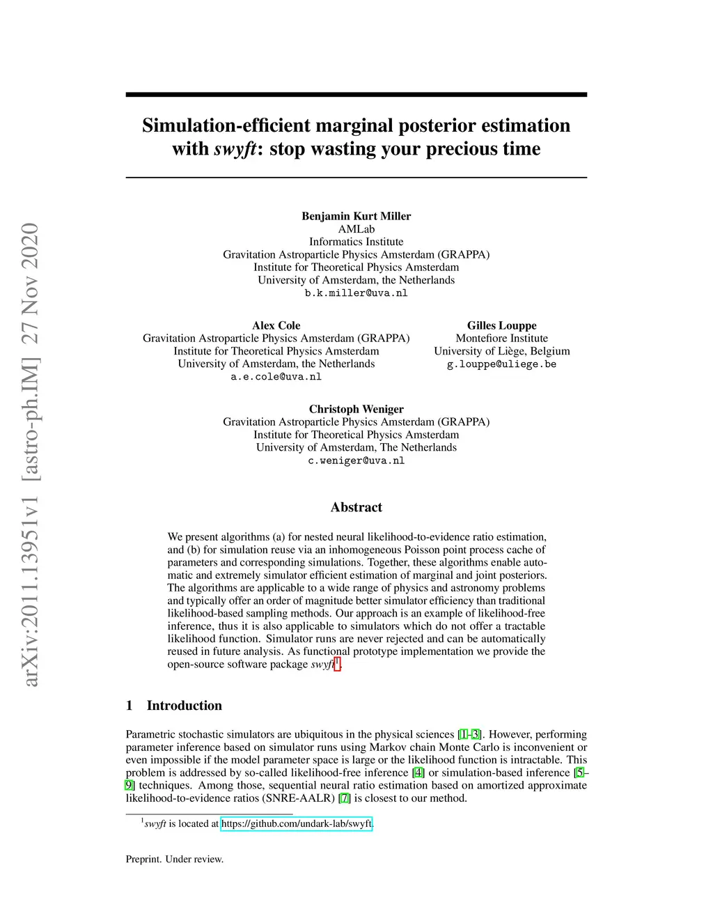 We present algorithms (a) for nested neural likelihood-to-evidence ratio estimation, and (b) for simulation reuse via an inhomogeneous Poisson point process cache of parameters and corresponding simulations. Together, these algorithms enable automatic and extremely simulator efficient estimation of marginal and joint posteriors. The algorithms are applicable to a wide range of physics and astronomy problems and typically offer an order of magnitude better simulator efficiency than traditional likelihood-based sampling methods. Our approach is an example of likelihood-free inference, thus it is also applicable to simulators which do not offer a tractable likelihood function. Simulator runs are never rejected and can be automatically reused in future analysis. As functional prototype implementation we provide the open-source software package swyft.