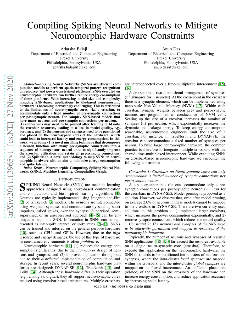Spiking Neural Networks (SNNs) are efficient computation models to perform spatio-temporal pattern recognition on {resource}- and {power}-constrained platforms. SNNs executed on neuromorphic hardware can further reduce energy consumption of these platforms. With increasing model size and complexity, mapping SNN-based applications to tile-based neuromorphic hardware is becoming increasingly challenging. This is attributed to the limitations of neuro-synaptic cores, viz. a crossbar, to accommodate only a fixed number of pre-synaptic connections per post-synaptic neuron. For complex SNN-based models that have many neurons and pre-synaptic connections per neuron, (1) connections may need to be pruned after training to fit onto the crossbar resources, leading to a loss in model quality, e.g., accuracy, and (2) the neurons and synapses need to be partitioned and placed on the neuro-sypatic cores of the hardware, which could lead to increased latency and energy consumption. In this work, we propose (1) a novel unrolling technique that decomposes a neuron function with many pre-synaptic connections into a sequence of homogeneous neural units to significantly improve the crossbar utilization and retain all pre-synaptic connections, and (2) SpiNeMap, a novel methodology to map SNNs on neuromorphic hardware with an aim to minimize energy consumption and spike latency.