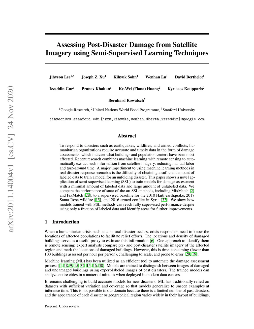 To respond to disasters such as earthquakes, wildfires, and armed conflicts, humanitarian organizations require accurate and timely data in the form of damage assessments, which indicate what buildings and population centers have been most affected. Recent research combines machine learning with remote sensing to automatically extract such information from satellite imagery, reducing manual labor and turn-around time. A major impediment to using machine learning methods in real disaster response scenarios is the difficulty of obtaining a sufficient amount of labeled data to train a model for an unfolding disaster. This paper shows a novel application of semi-supervised learning (SSL) to train models for damage assessment with a minimal amount of labeled data and large amount of unlabeled data. We compare the performance of state-of-the-art SSL methods, including MixMatch and FixMatch, to a supervised baseline for the 2010 Haiti earthquake, 2017 Santa Rosa wildfire, and 2016 armed conflict in Syria. We show how models trained with SSL methods can reach fully supervised performance despite using only a fraction of labeled data and identify areas for further improvements.