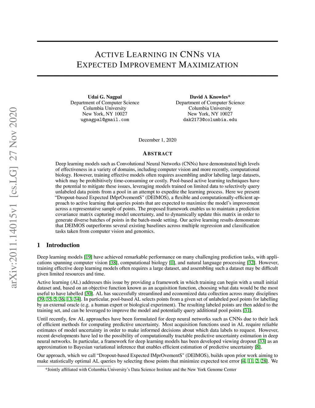 Deep learning models such as Convolutional Neural Networks (CNNs) have demonstrated high levels of effectiveness in a variety of domains, including computer vision and more recently, computational biology. However, training effective models often requires assembling and/or labeling large datasets, which may be prohibitively time-consuming or costly. Pool-based active learning techniques have the potential to mitigate these issues, leveraging models trained on limited data to selectively query unlabeled data points from a pool in an attempt to expedite the learning process. Here we present "Dropout-based Expected IMprOvementS" (DEIMOS), a flexible and computationally-efficient approach to active learning that queries points that are expected to maximize the model's improvement across a representative sample of points. The proposed framework enables us to maintain a prediction covariance matrix capturing model uncertainty, and to dynamically update this matrix in order to generate diverse batches of points in the batch-mode setting. Our active learning results demonstrate that DEIMOS outperforms several existing baselines across multiple regression and classification tasks taken from computer vision and genomics.