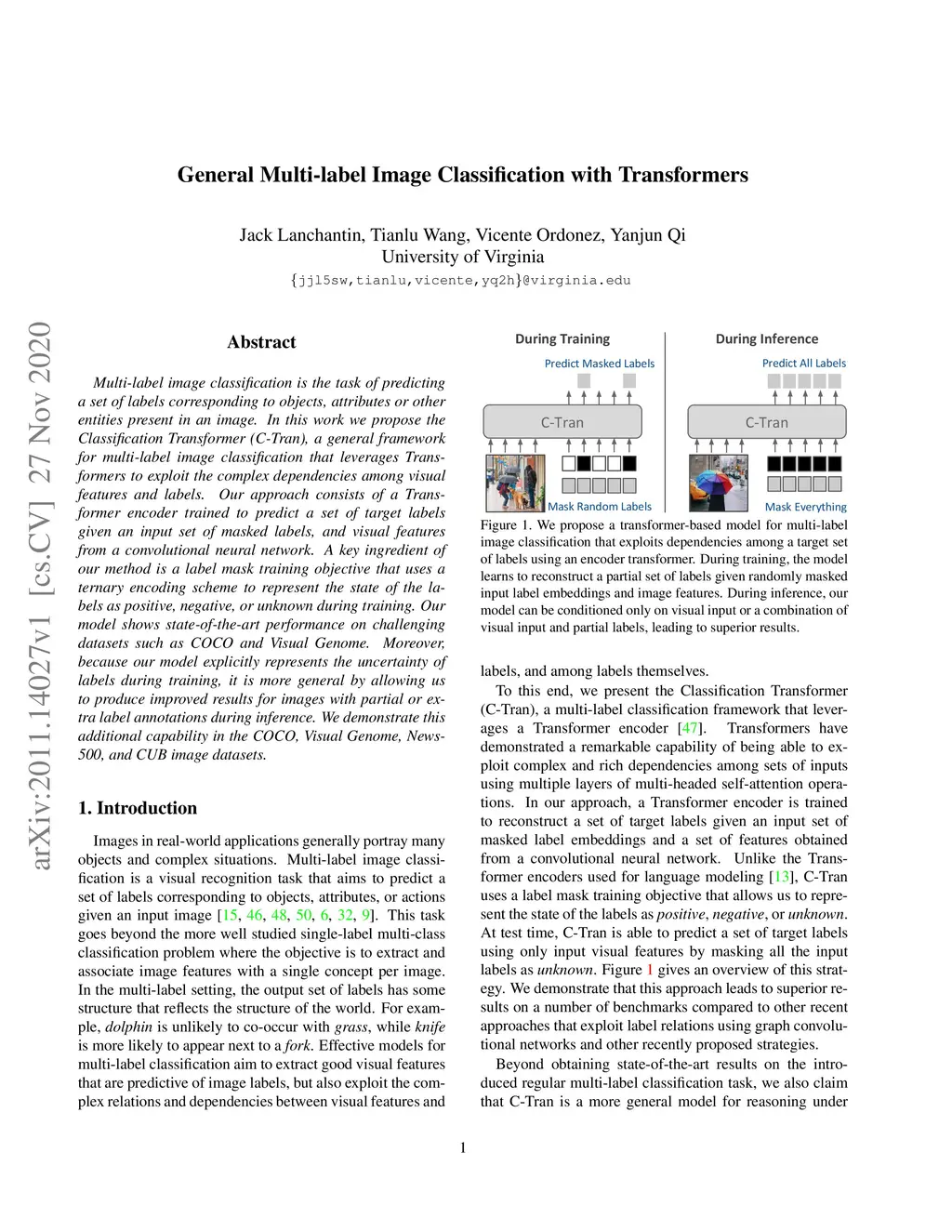 Multi-label image classification is the task of predicting a set of labels corresponding to objects, attributes or other entities present in an image. In this work we propose the Classification Transformer (C-Tran), a general framework for multi-label image classification that leverages Transformers to exploit the complex dependencies among visual features and labels. Our approach consists of a Transformer encoder trained to predict a set of target labels given an input set of masked labels, and visual features from a convolutional neural network. A key ingredient of our method is a label mask training objective that uses a ternary encoding scheme to represent the state of the labels as positive, negative, or unknown during training. Our model shows state-of-the-art performance on challenging datasets such as COCO and Visual Genome. Moreover, because our model explicitly represents the uncertainty of labels during training, it is more general by allowing us to produce improved results for images with partial or extra label annotations during inference. We demonstrate this additional capability in the COCO, Visual Genome, News500, and CUB image datasets.