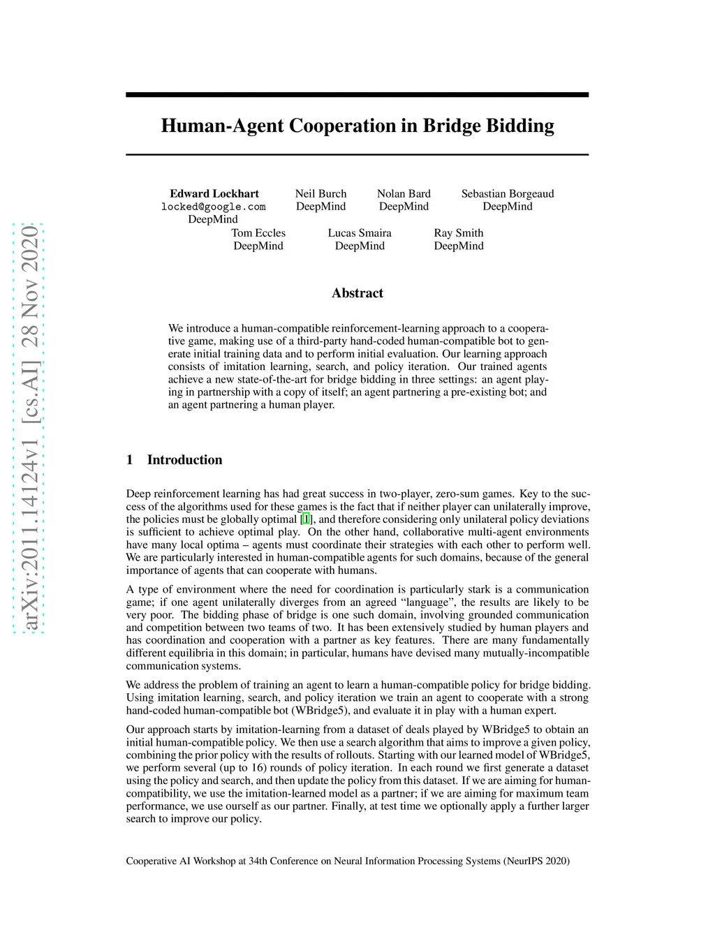 We introduce a human-compatible reinforcement-learning approach to a cooperative game, making use of a third-party hand-coded human-compatible bot to generate initial training data and to perform initial evaluation. Our learning approach consists of imitation learning, search, and policy iteration. Our trained agents achieve a new state-of-the-art for bridge bidding in three settings: an agent playing in partnership with a copy of itself; an agent partnering a pre-existing bot; and an agent partnering a human player.