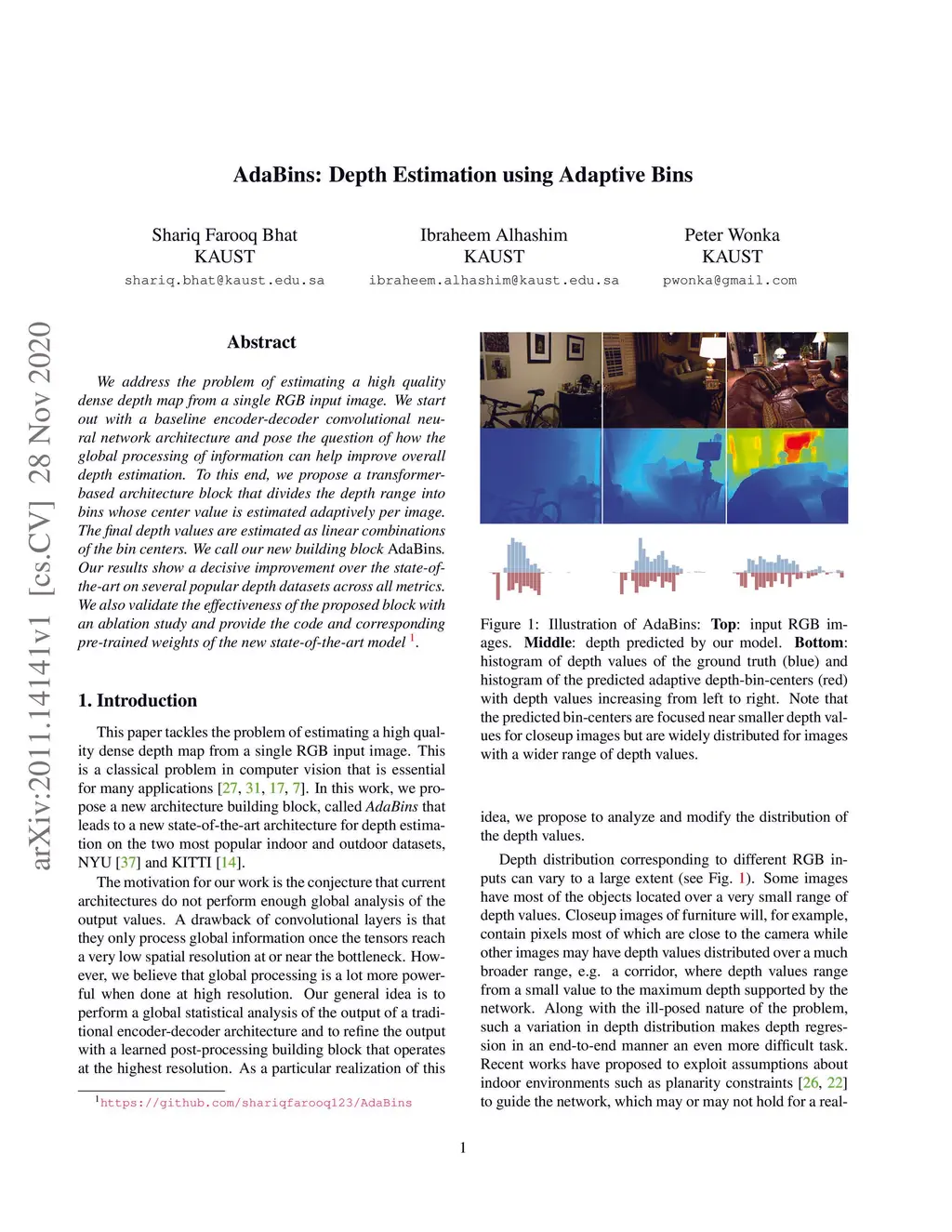 AdaBins: Depth Estimation using Adaptive Bins