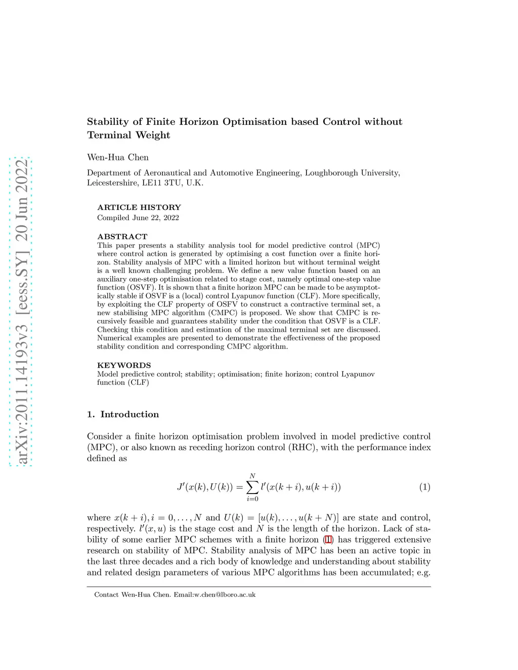 This paper presents a stability analysis tool for model predictive control (MPC) where control action is generated by optimising a cost function over a finite horizon. Stability analysis of MPC with a limited horizon but without terminal weight is a well known challenging problem. We define a new value function based on an auxiliary one-step optimisation related to stage cost, namely optimal one-step value function (OSVF). It is shown that a finite horizon MPC can be made to be asymptotically stable if OSVF is a (local) control Lyapunov function (CLF). More specifically, by exploiting the CLF property of OSFV to construct a contractive terminal set, a new stabilising MPC algorithm (CMPC) is proposed. We show that CMPC is recursively feasible and guarantees stability under the condition that OSVF is a CLF. Checking this condition and estimation of the maximal terminal set are discussed. Numerical examples are presented to demonstrate the effectiveness of the proposed stability condition and corresponding CMPC algorithm.