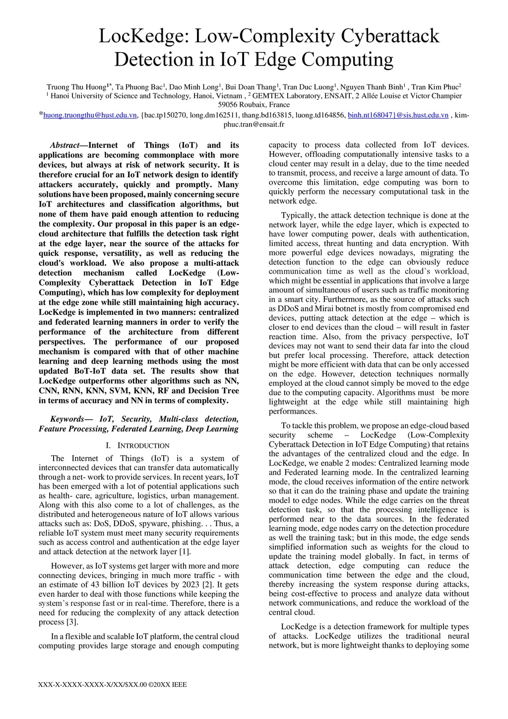 Internet of Things and its applications are becoming commonplace with more devices, but always at risk of network security. It is therefore crucial for an IoT network design to identify attackers accurately, quickly and promptly. Many solutions have been proposed, mainly concerning secure IoT architectures and classification algorithms, but none of them have paid enough attention to reducing the complexity. Our proposal in this paper is an edge cloud architecture that fulfills the detection task right at the edge layer, near the source of the attacks for quick response, versatility, as well as reducing the workload of the cloud. We also propose a multi attack detection mechanism called LocKedge Low Complexity Cyberattack Detection in IoT Edge Computing, which has low complexity for deployment at the edge zone while still maintaining high accuracy. LocKedge is implemented in two manners: centralized and federated learning manners in order to verify the performance of the architecture from different perspectives. The performance of our proposed mechanism is compared with that of other machine learning and deep learning methods using the most updated BoT IoT data set. The results show that LocKedge outperforms other algorithms such as NN, CNN, RNN, KNN, SVM, KNN, RF and Decision Tree in terms of accuracy and NN in terms of complexity.