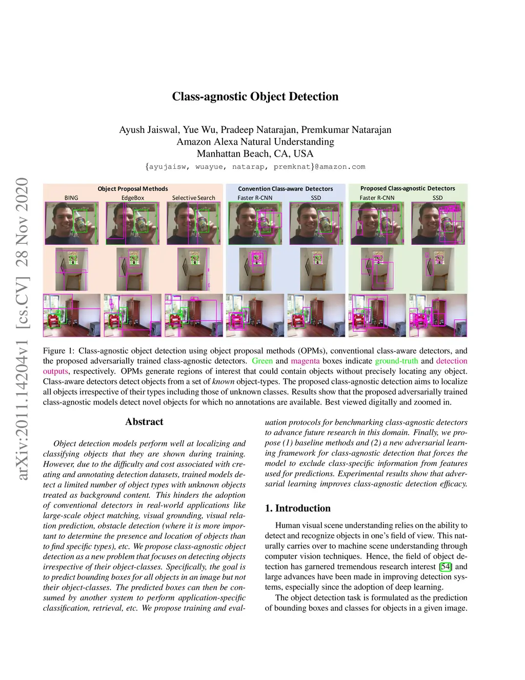 Object detection models perform well at localizing and classifying objects that they are shown during training. However, due to the difficulty and cost associated with creating and annotating detection datasets, trained models detect a limited number of object types with unknown objects treated as background content. This hinders the adoption of conventional detectors in real-world applications like large-scale object matching, visual grounding, visual relation prediction, obstacle detection (where it is more important to determine the presence and location of objects than to find specific types), etc. We propose class-agnostic object detection as a new problem that focuses on detecting objects irrespective of their object-classes. Specifically, the goal is to predict bounding boxes for all objects in an image but not their object-classes. The predicted boxes can then be consumed by another system to perform application-specific classification, retrieval, etc. We propose training and evaluation protocols for benchmarking class-agnostic detectors to advance future research in this domain. Finally, we propose (1) baseline methods and (2) a new adversarial learning framework for class-agnostic detection that forces the model to exclude class-specific information from features used for predictions. Experimental results show that adversarial learning improves class-agnostic detection efficacy.