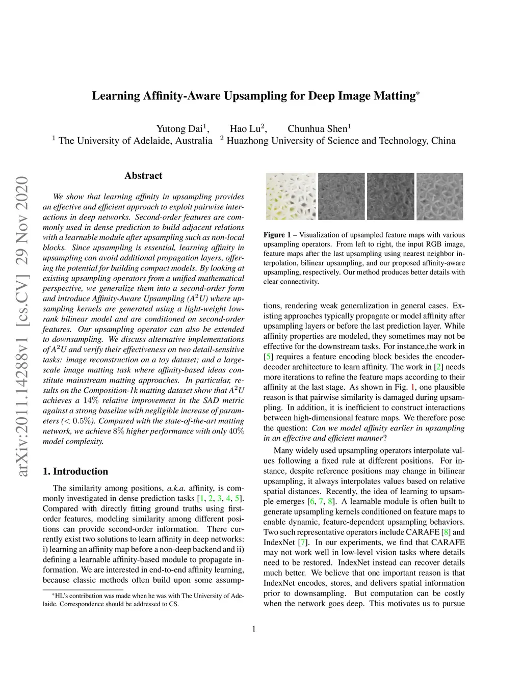 We show that learning affinity in upsampling provides an effective and efficient approach to exploit pairwise interactions in deep networks. Second-order features are commonly used in dense prediction to build adjacent relations with a learnable module after upsampling such as non-local blocks. Since upsampling is essential, learning affinity in upsampling can avoid additional propagation layers, offering the potential for building compact models. By looking at existing upsampling operators from a unified mathematical perspective, we generalize them into a second-order form and introduce Affinity-Aware Upsampling (A2U) where upsampling kernels are generated using a light-weight lowrank bilinear model and are conditioned on second-order features. Our upsampling operator can also be extended to downsampling. We discuss alternative implementations of A2U and verify their effectiveness on two detail-sensitive tasks: image reconstruction on a toy dataset; and a largescale image matting task where affinity-based ideas constitute mainstream matting approaches. In particular, results on the Composition-1k matting dataset show that A2U achieves a 14% relative improvement in the SAD metric against a strong baseline with negligible increase of parameters (<0.5%). Compared with the state-of-the-art matting network, we achieve 8% higher performance with only 40% model complexity.