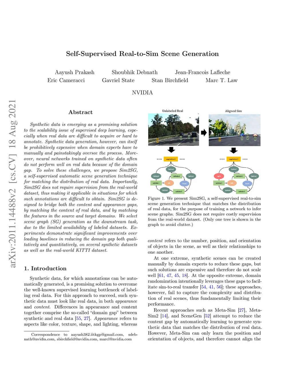 Synthetic data is emerging as a promising solution to the scalability issue of supervised deep learning, especially when real data are difficult to acquire or hard to annotate. Synthetic data generation, however, can itself be prohibitively expensive when domain experts have to manually and painstakingly oversee the process. Moreover, neural networks trained on synthetic data often do not perform well on real data because of the domain gap. To solve these challenges, we propose Sim2SG, a self-supervised automatic scene generation technique for matching the distribution of real data. Importantly, Sim2SG does not require supervision from the real-world dataset, thus making it applicable in situations for which such annotations are difficult to obtain. Sim2SG is designed to bridge both the content and appearance gaps, by matching the content of real data, and by matching the features in the source and target domains. We select scene graph (SG) generation as the downstream task, due to the limited availability of labeled datasets. Experiments demonstrate significant improvements over leading baselines in reducing the domain gap both qualitatively and quantitatively, on several synthetic datasets as well as the real-world KITTI dataset.