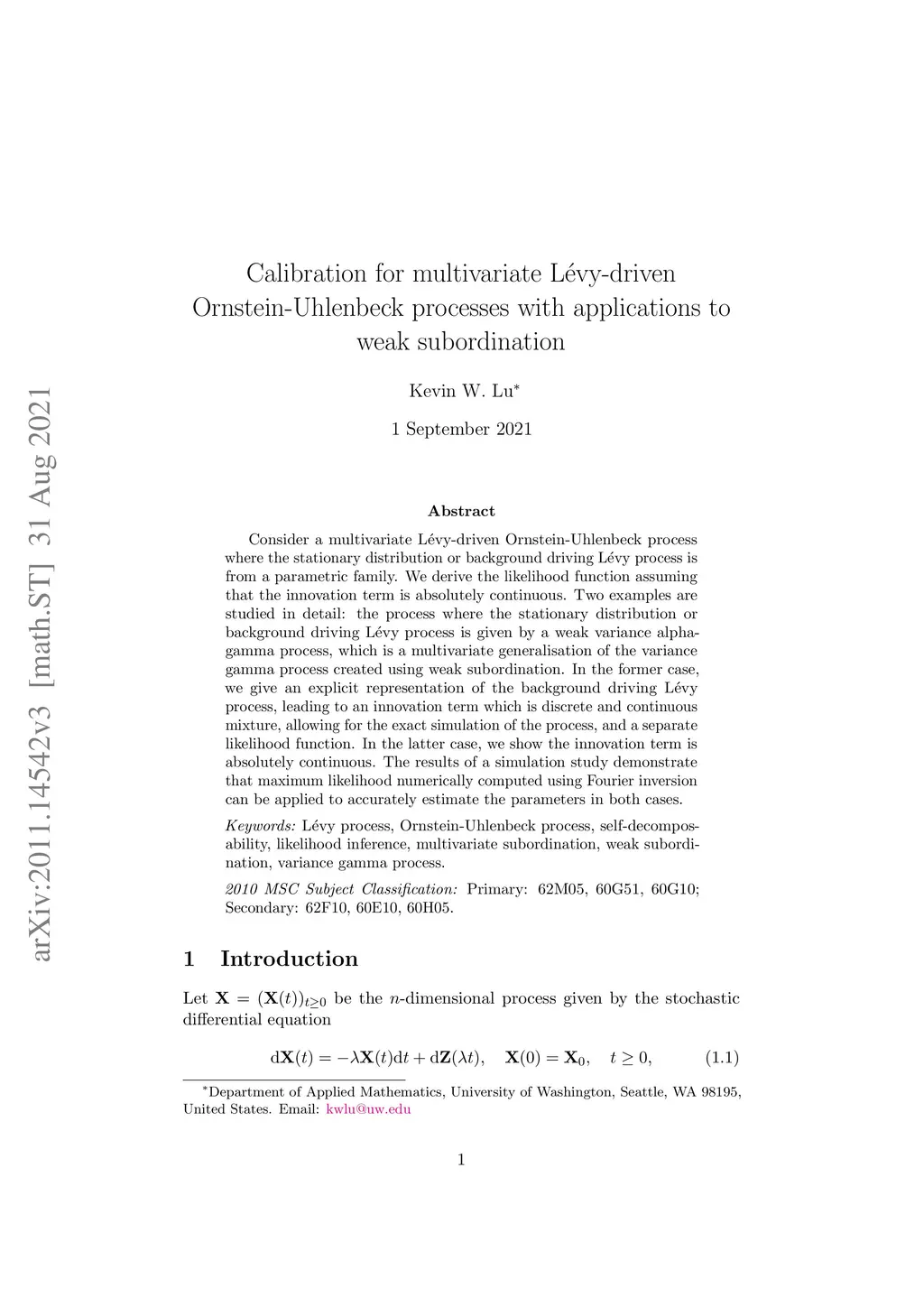 Consider a multivariate L\'evy-driven Ornstein-Uhlenbeck process where the stationary distribution or background driving L\'evy process is from a parametric family. We derive a likelihood function allowing for parameter estimation of such a process using Fourier inversion assuming that the innovation term is absolutely continuous. We further give a method for simulating the observations based on an approximation of the innovation term and prove its convergence. Two examples are studied in detail: the process where the stationary distribution or background driving L\'evy process is given by a weak variance alpha-gamma process, which is a multivariate generalisation of the variance gamma process created using weak subordination. In the former case, we give an explicit representation of the background driving L\'evy process, leading to an innovation term with a mixed-type distribution, and a separate likelihood function. In the latter case, we show the innovation term is absolutely continuous. The results of a simulation study demonstrate that our likelihood method can be applied to accurately estimate the parameters in both cases.