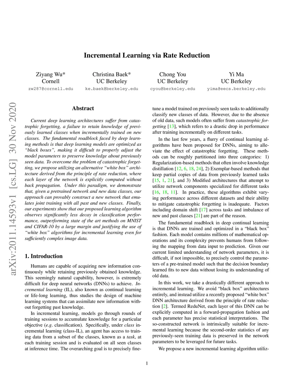Current deep learning architectures suffer from catastrophic forgetting, a failure to retain knowledge of previously learned classes when incrementally trained on new classes. The fundamental roadblock faced by deep learning methods is that deep learning models are optimized as "black boxes," making it difficult to properly adjust the model parameters to preserve knowledge about previously seen data. To overcome the problem of catastrophic forgetting, we propose utilizing an alternative "white box" architecture derived from the principle of rate reduction, where each layer of the network is explicitly computed without back propagation. Under this paradigm, we demonstrate that, given a pre-trained network and new data classes, our approach can provably construct a new network that emulates joint training with all past and new classes. Finally, our experiments show that our proposed learning algorithm observes significantly less decay in classification performance, outperforming state of the art methods on MNIST and CIFAR-10 by a large margin and justifying the use of "white box" algorithms for incremental learning even for sufficiently complex image data.