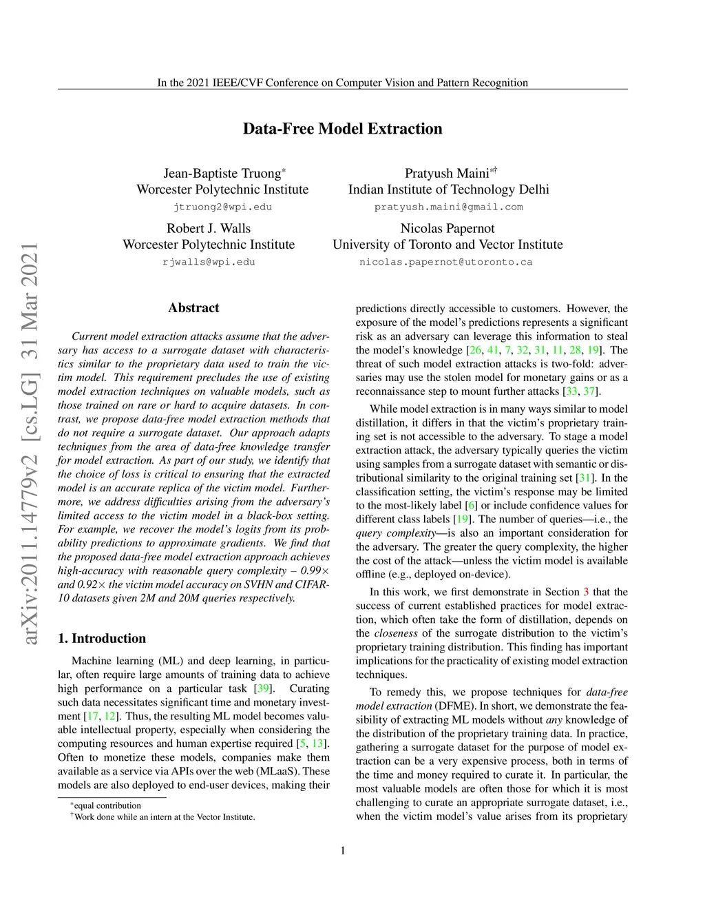 Current model extraction attacks assume that the adversary has access to a surrogate dataset with characteristics similar to the proprietary data used to train the victim model. This requirement precludes the use of existing model extraction techniques on valuable models, such as those trained on rare or hard to acquire datasets. In contrast, we propose data-free model extraction methods that do not require a surrogate dataset. Our approach adapts techniques from the area of data-free knowledge transfer for model extraction. As part of our study, we identify that the choice of loss is critical to ensuring that the extracted model is an accurate replica of the victim model. Furthermore, we address difficulties arising from the adversary's limited access to the victim model in a black-box setting. For example, we recover the model's logits from its probability predictions to approximate gradients. We find that the proposed data-free model extraction approach achieves high-accuracy with reasonable query complexity -- 0.99x and 0.92x the victim model accuracy on SVHN and CIFAR-10 datasets given 2M and 20M queries respectively.