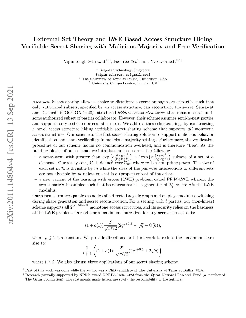 Extremal Set Theory and LWE Based Access Structure Hiding Verifiable