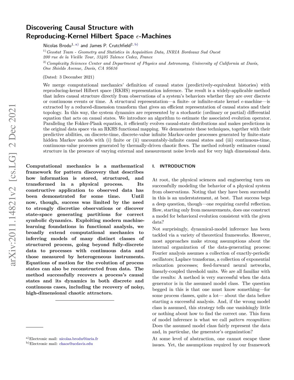 We merge computational mechanics' definition of causal states (predictively-equivalent histories) with reproducing-kernel Hilbert space (RKHS) representation inference. The result is a widely-applicable method that infers causal structure directly from observations of a system's behaviors whether they are over discrete or continuous events or time. A structural representation -- a finite- or infinite-state kernel -machine -- is extracted by a reduced-dimension transform that gives an efficient representation of causal states and their topology. In this way, the system dynamics are represented by a stochastic (ordinary or partial) differential equation that acts on causal states. We introduce an algorithm to estimate the associated evolution operator. Paralleling the Fokker-Plank equation, it efficiently evolves causal-state distributions and makes predictions in the original data space via an RKHS functional mapping. We demonstrate these techniques, together with their predictive abilities, on discrete-time, discrete-value infinite Markov-order processes generated by finite-state hidden Markov models with (i) finite or (ii) uncountably-infinite causal states and (iii) a continuous-time, continuous-value process generated by a thermally-driven chaotic flow. The method robustly estimates causal structure in the presence of varying external and measurement noise levels.