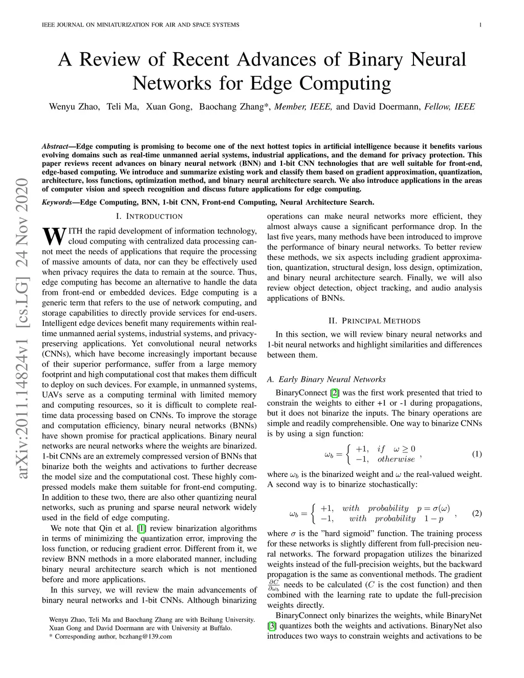 Edge computing is promising to become one of the next hottest topics in artificial intelligence because it benefits various evolving domains such as real-time unmanned aerial systems, industrial applications, and the demand for privacy protection. This paper reviews recent advances on binary neural network (BNN) and 1-bit CNN technologies that are well suitable for front-end, edge-based computing. We introduce and summarize existing work and classify them based on gradient approximation, quantization, architecture, loss functions, optimization method, and binary neural architecture search. We also introduce applications in the areas of computer vision and speech recognition and discuss future applications for edge computing.