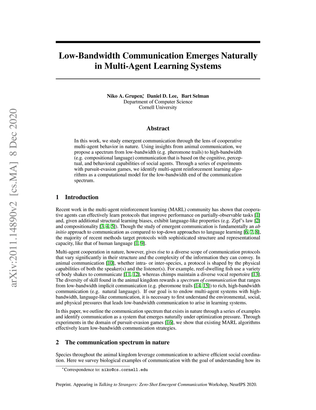 In this work, we study emergent communication through the lens of cooperative multi-agent behavior in nature. Using insights from animal communication, we propose a spectrum from low-bandwidth (e.g. pheromone trails) to high-bandwidth (e.g. compositional language) communication that is based on the cognitive, perceptual, and behavioral capabilities of social agents. Through a series of experiments with pursuit-evasion games, we identify multi-agent reinforcement learning algorithms as a computational model for the low-bandwidth end of the communication spectrum.