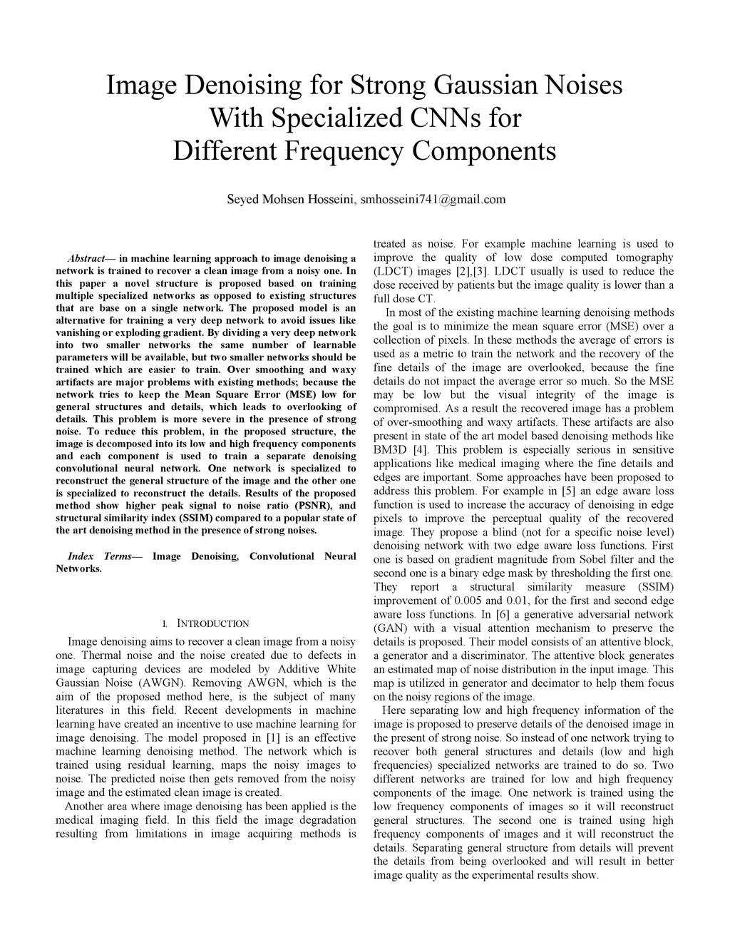 In machine learning approach to image denoising a network is trained to recover a clean image from a noisy one. In this paper a novel structure is proposed based on training multiple specialized networks as opposed to existing structures that are base on a single network. The proposed model is an alternative for training a very deep network to avoid issues like vanishing or exploding gradient. By dividing a very deep network into two smaller networks the same number of learnable parameters will be available, but two smaller networks should be trained which are easier to train. Over smoothing and waxy artifacts are major problems with existing methods; because the network tries to keep the Mean Square Error (MSE) low for general structures and details, which leads to overlooking of details. This problem is more severe in the presence of strong noise. To reduce this problem, in the proposed structure, the image is decomposed into its low and high frequency components and each component is used to train a separate denoising convolutional neural network. One network is specialized to reconstruct the general structure of the image and the other one is specialized to reconstruct the details. Results of the proposed method show higher peak signal to noise ratio (PSNR), and structural similarity index (SSIM) compared to a popular state of the art denoising method in the presence of strong noises.