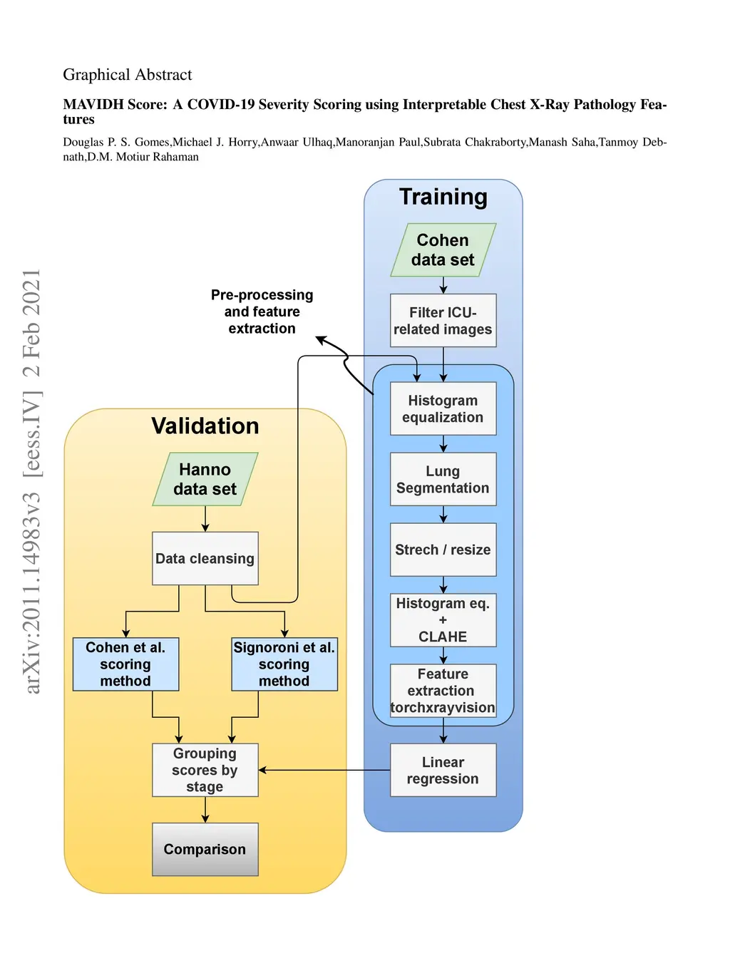 The application of computer vision for COVID-19 diagnosis is complex and challenging, given the risks associated with patient misclassifications. Arguably, the primary value of medical imaging for COVID-19 lies rather on patient prognosis. Radiological images can guide physicians assessing the severity of the disease, and a series of images from the same patient at different stages can help to gauge disease progression. Hence, a simple method based on lung-pathology interpretable features for scoring disease severity from Chest X-rays is proposed here. As the primary contribution, this method correlates well to patient severity in different stages of disease progression with competitive results compared to other existing, more complex methods. An original data selection approach is also proposed, allowing the simple model to learn the severity-related features. It is hypothesized that the resulting competitive performance presented here is related to the method being feature-based rather than reliant on lung involvement or opacity as others in the literature. A second contribution comes from the validation of the results, conceptualized as the scoring of patients groups from different stages of the disease. Besides performing such validation on an independent data set, the results were also compared with other proposed scoring methods in the literature. The results show that there is a significant correlation between the scoring system (MAVIDH) and patient outcome, which could potentially help physicians rating and following disease progression in COVID-19 patients.
