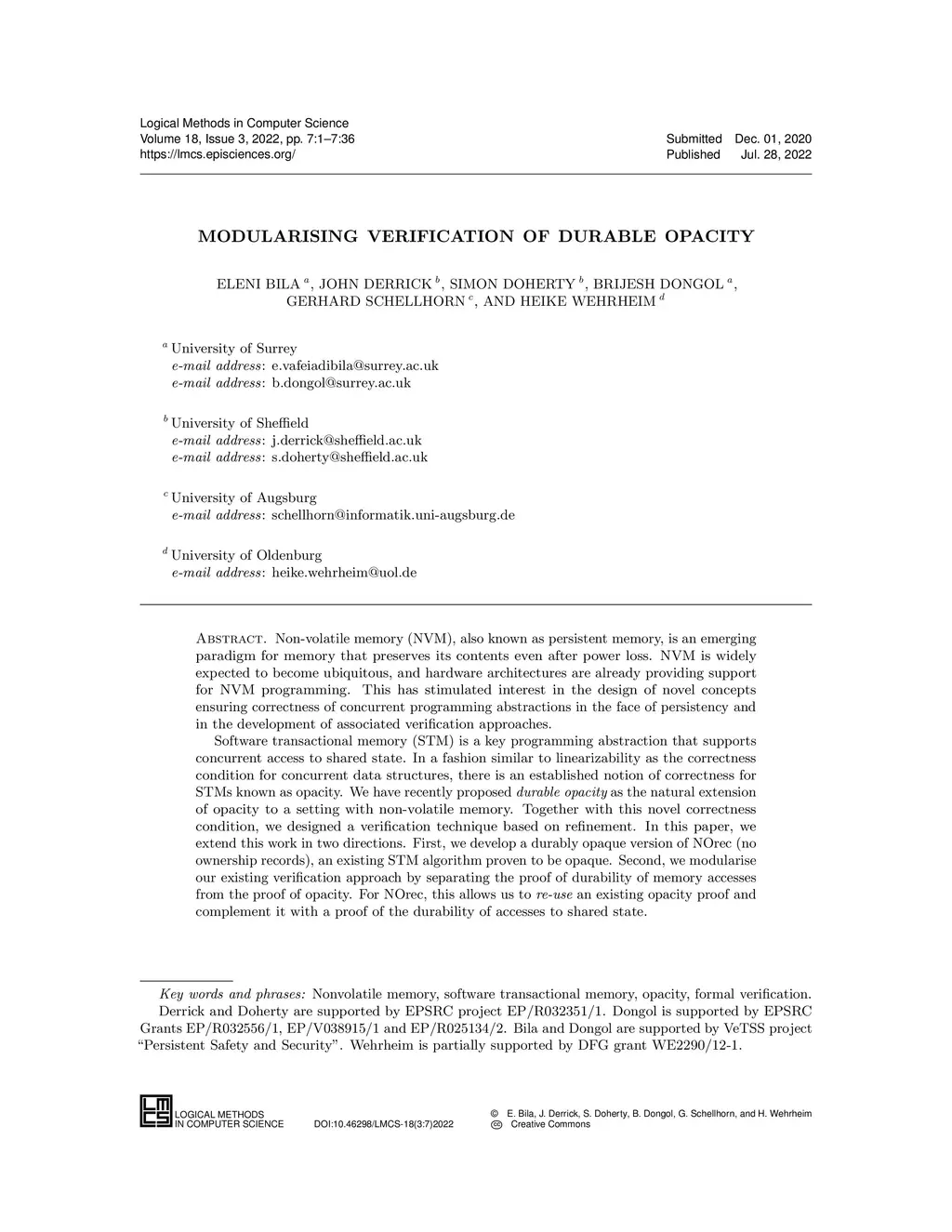 Non-volatile memory (NVM), also known as persistent memory, is an emerging paradigm for memory that preserves its contents even after power loss. NVM is widely expected to become ubiquitous, and hardware architectures are already providing support for NVM programming. This has stimulated interest in the design of novel concepts ensuring correctness of concurrent programming abstractions in the face of persistency and in the development of associated verification approaches. Software transactional memory (STM) is a key programming abstraction that supports concurrent access to shared state. In a fashion similar to linearizability as the correctness condition for concurrent data structures, there is an established notion of correctness for STMs known as opacity. We have recently proposed durable opacity as the natural extension of opacity to a setting with non-volatile memory. Together with this novel correctness condition, we designed a verification technique based on refinement. In this paper, we extend this work in two directions. First, we develop a durably opaque version of NOrec (no ownership records), an existing STM algorithm proven to be opaque. Second, we modularise our existing verification approach by separating the proof of durability of memory accesses from the proof of opacity. For NOrec, this allows us to re-use an existing opacity proof and complement it with a proof of the durability of accesses to shared state.