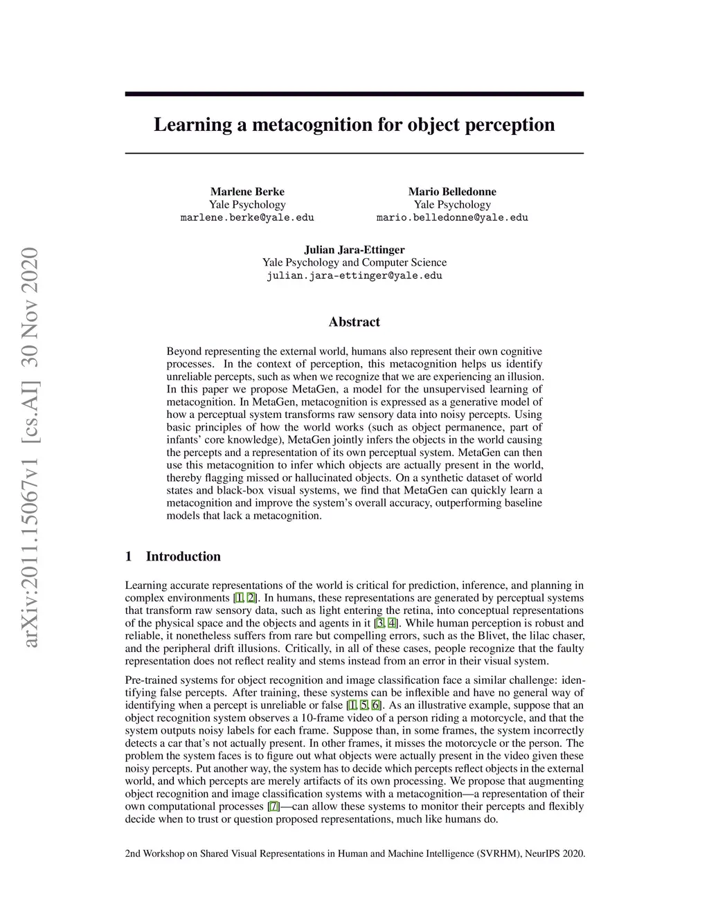 Beyond representing the external world, humans also represent their own cognitive processes. In the context of perception, this metacognition helps us identify unreliable percepts, such as when we recognize that we are seeing an illusion. Here we propose MetaGen, a model for the unsupervised learning of metacognition. In MetaGen, metacognition is expressed as a generative model of how a perceptual system produces noisy percepts. Using basic principles of how the world works (such as object permanence, part of infants' core knowledge), MetaGen jointly infers the objects in the world causing the percepts and a representation of its own perceptual system. MetaGen can then use this metacognition to infer which objects are actually present in the world. On simulated data, we find that MetaGen quickly learns a metacognition and improves overall accuracy, outperforming models that lack a metacognition.