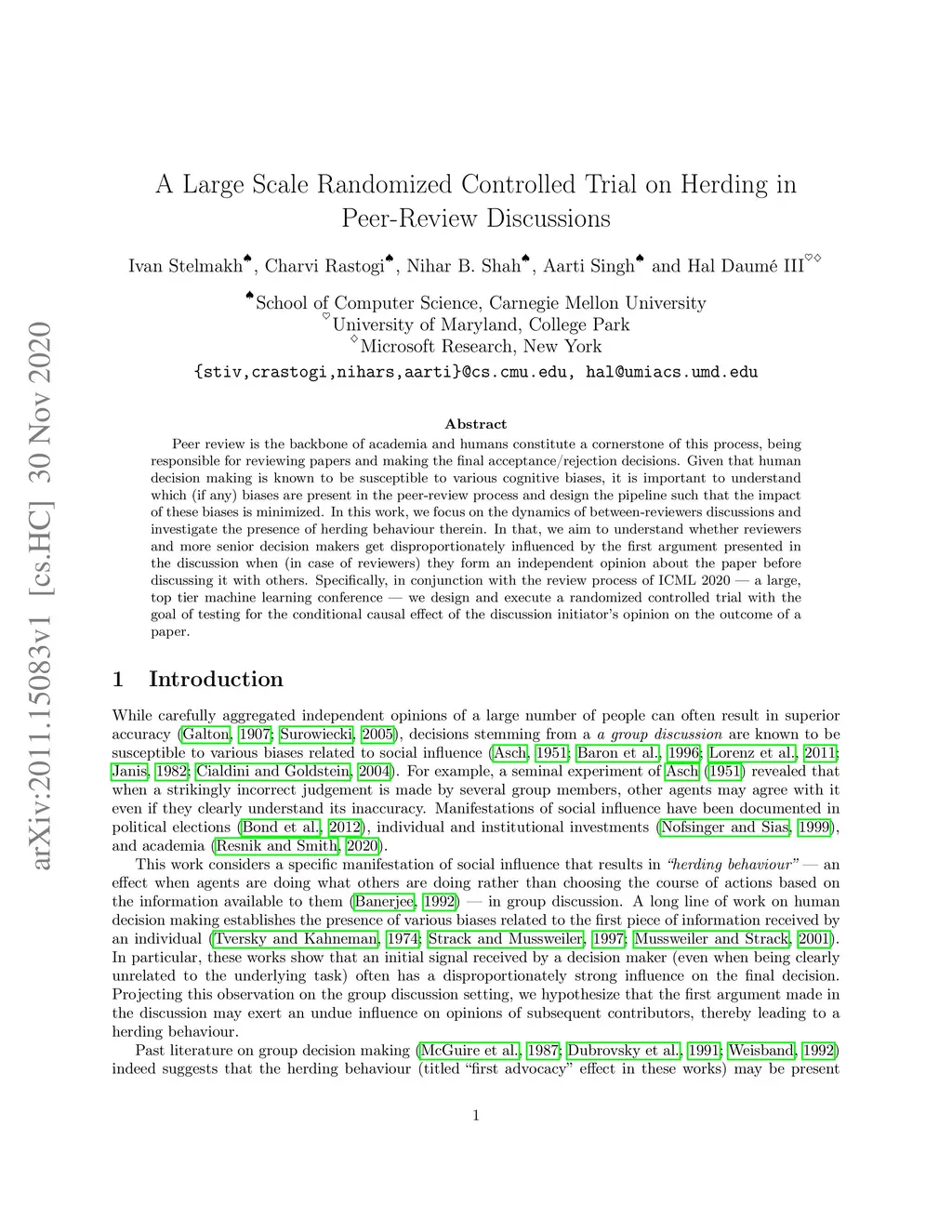 Peer review is the backbone of academia and humans constitute a cornerstone of this process, being responsible for reviewing papers and making the final acceptance/rejection decisions. Given that human decision making is known to be susceptible to various cognitive biases, it is important to understand which (if any) biases are present in the peer-review process and design the pipeline such that the impact of these biases is minimized. In this work, we focus on the dynamics of between-reviewers discussions and investigate the presence of herding behaviour therein. In that, we aim to understand whether reviewers and more senior decision makers get disproportionately influenced by the first argument presented in the discussion when (in case of reviewers) they form an independent opinion about the paper before discussing it with others. Specifically, in conjunction with the review process of ICML 2020 -- a large, top tier machine learning conference -- we design and execute a randomized controlled trial with the goal of testing for the conditional causal effect of the discussion initiator's opinion on the outcome of a paper.